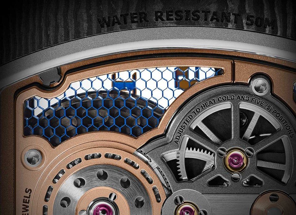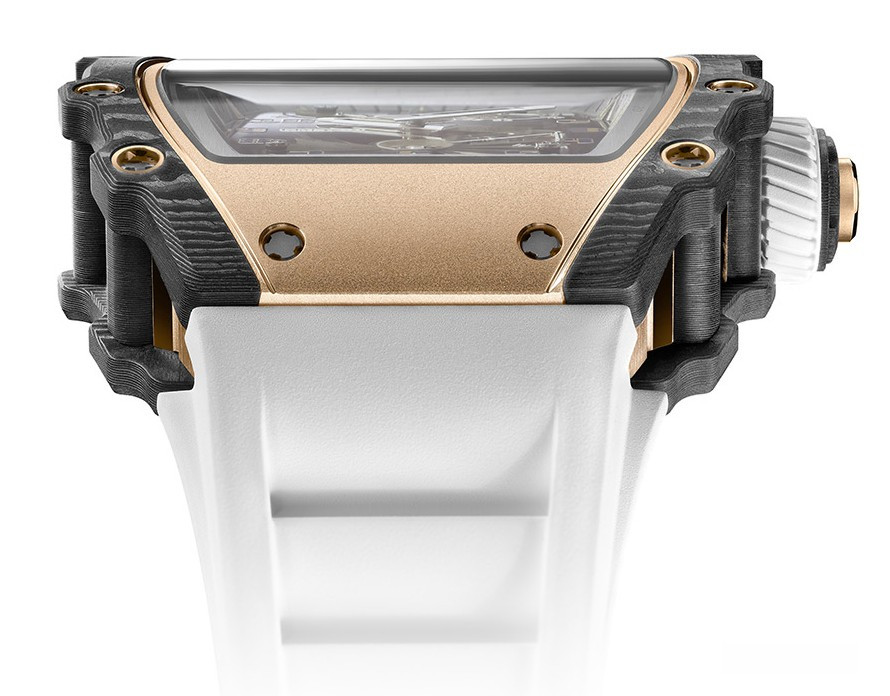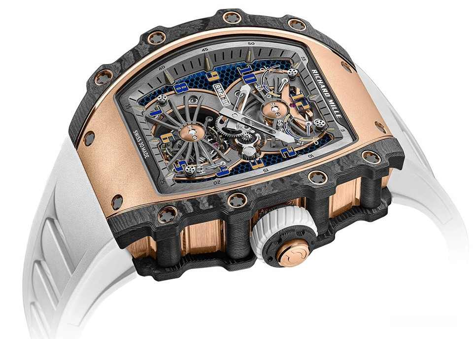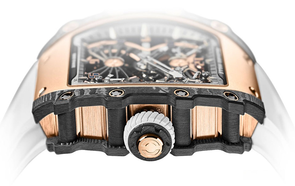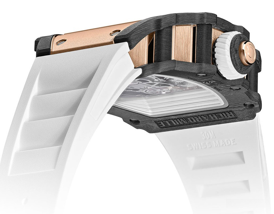Часы Richard Mille RM 21-01 Tourbillon Aerodyne представлены в корпусе из розового золота 18к и карбона ТРТ размером 42.68 x 50.12 x 14.3 мм водонепроницаемостью 50 метров. Внутри корпуса находится механизм с ручным заводом, Калибр RM 21-01, обладающий запасом хода 72 часов. На сером циферблате отображаются часы, минуты, запас хода, индикатор крутящего момента. Часы поставляются на каучуковом ремешке с титановой вставкой. Серия ограничена - 50 шт.