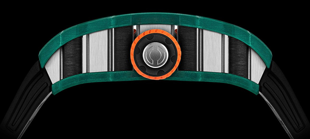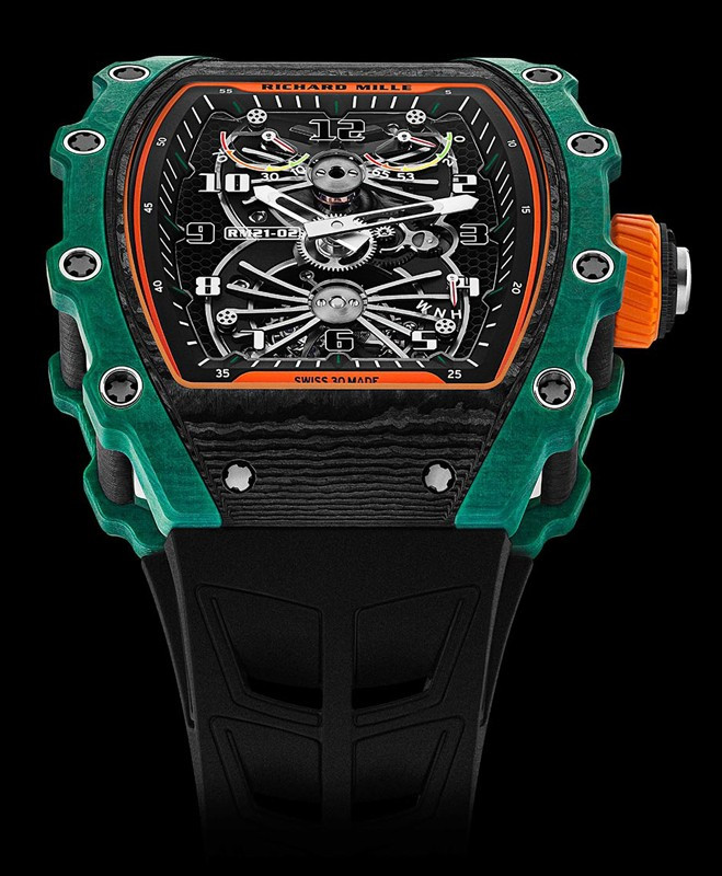 Часы Richard Mille RM 21-02 Tourbillon Aerodyne представлены в корпусе размером 42.68 x 50.12 x 14.3 мм из карбона и кварца ТРТ водонепроницаемостью 50 метров. Внутри корпуса установлен механизм с ручным заводом, Калибр RM21-01, обладающий запасом хода 70 часов. На сером скелетированном циферблате отображаются часы, минуты, секунды, запас хода. Часы поставляются на каучучковом ремешке с титановой застежкой. Серия ограничена - 50 шт.