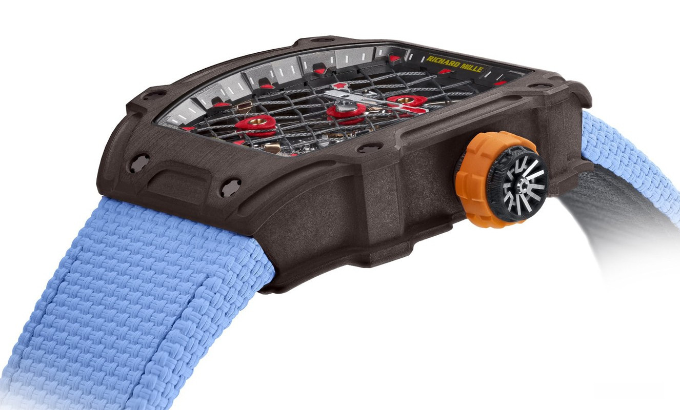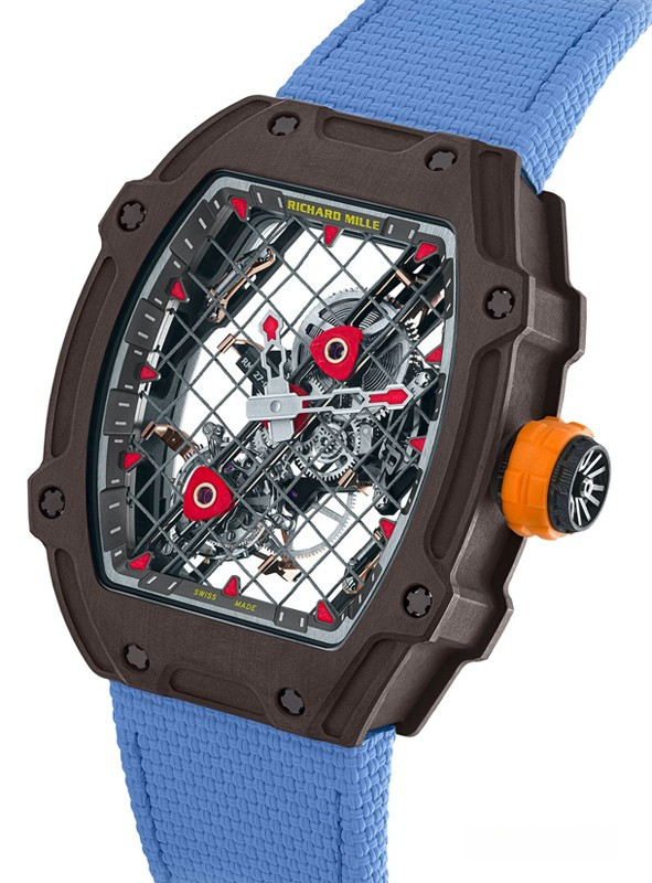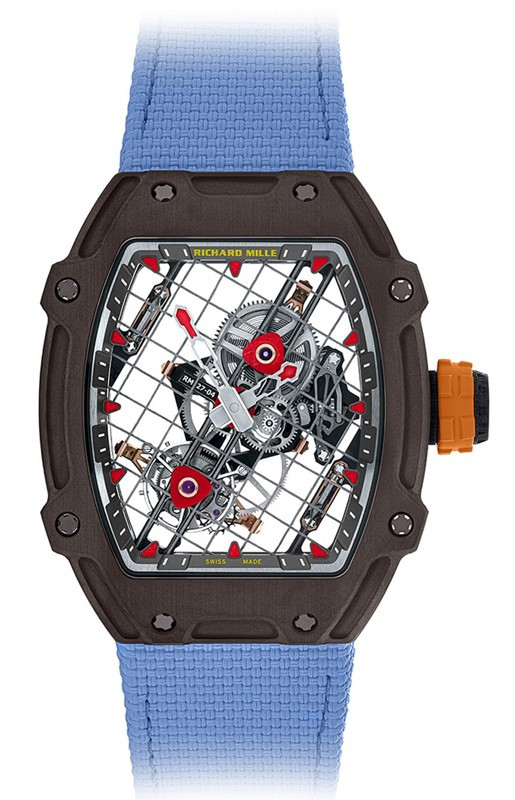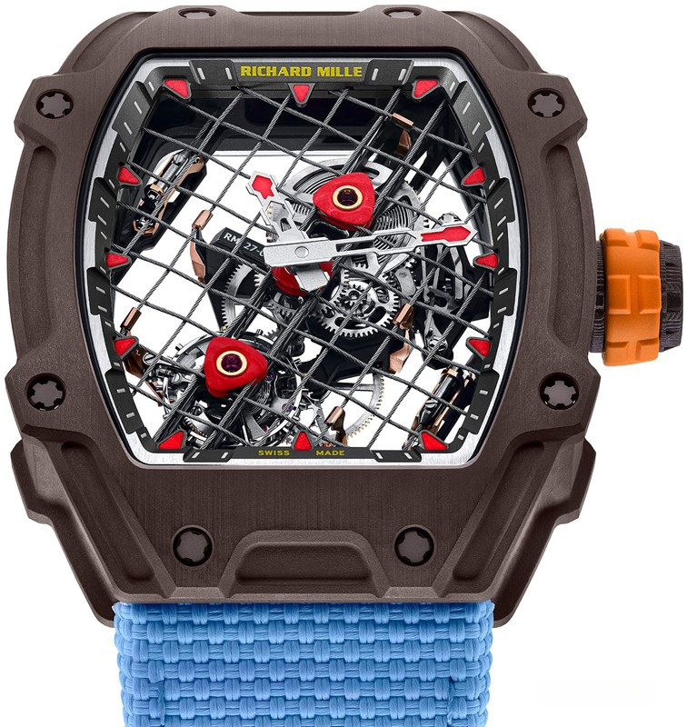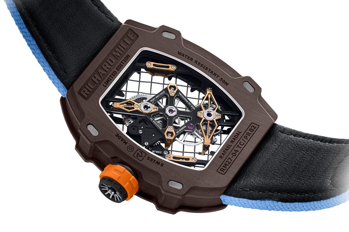 В честь 10-й годовщины отношений Richard Mille и Надаля, модель RM 027 выпущена в пятом поколении в виде нового и удивительно дорогого RM 27-04. Новый RM 27-04 обладает весом тридцать граммов (с ремешком!) Всего 3,4 грамма для механизма с турбийоном с ручным заводом и подвесом на тросике. Корпус сделан из «TitaCarb». Модель 27-04 имеет размеры 38.4 х 47.25 х 11.4 мм. Это скелетированные часы в форме тонно. Сапфировые стекла спереди и сзади открывают вид на невероятно крутой, вдохновленный теннисом, дизайн механизма, который подвешен в решетке, созданной стальным тросом диаметром 0,27 мм, который удерживает механизм на месте с помощью двух красных талрепов. Плетение стального троса навеяно теннисной ракеткой. Механизм RM27-04 с ручным заводом, оснащенный турбийоном, который был полностью скелетонирован и виден с любой стороны темного матового легкого корпуса. Часы Richard Mille RM 27-04 Tourbillon Rafael Nadal представлены ограниченной серией 50 штук.