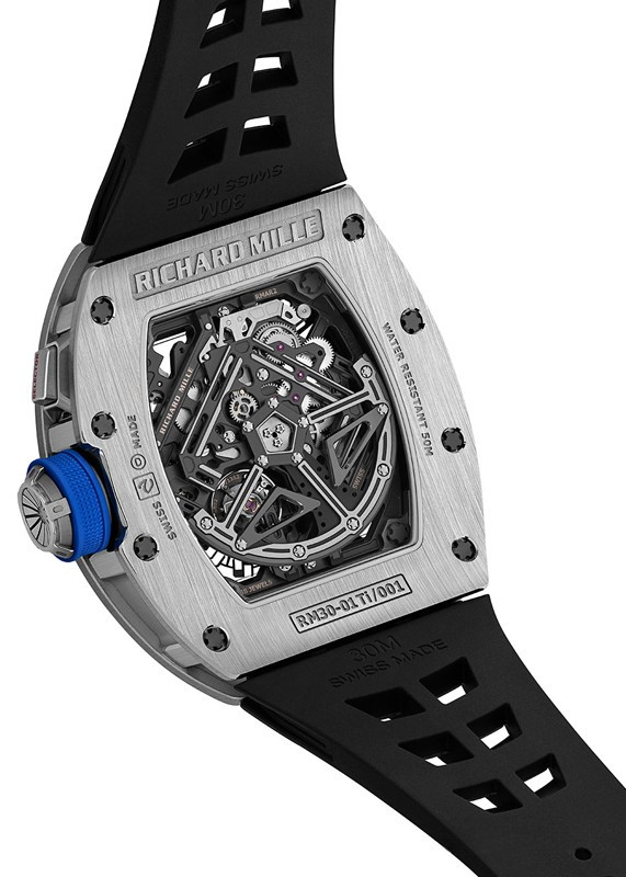 Часы Richard Mille RM 30-01 Automatic Declutchable Rotor представлены в корпусе размером 42 x 49.94 x 17.59 мм из титана водонепроницаемостью 50 метров. Внутри корпуса установлен автоматический механизм, Калибр RM 30-01, обладающий запасом хода 55 часов. На черном циферблате отображаются часы, минуты, секунды, дата, запас хода. Часы поставляются на каучуковом ремешке с титановой затежкой.