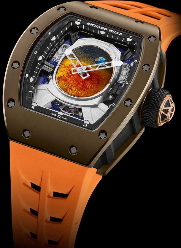 Певец, рэпер, автор песен, продюсер, дизайнер, предприниматель Фаррелл Уильямс совместно с Richard Mille представили модель Richard Mille RM 52-05 Tourbillon Pharrell Williams. В новой модели RM 52-05 Фаррелл воплотил марсианский пейзаж с видом на Землю. Красная планета отсвечивает в защитном стекле скафандра космонавта. Циферблат изготовлен из синего авантюрина, выполняющего роль бездны космического пространства. Часы представлены в корпусе формы тонно размером 49.94 х 42.35 х 16.15 мм из карбона ТРТ. Водонепроницаемость 30 метров. Внутри корпуса находится механизм с ручным заводом, Калибр RM52-05, обладающий запасом хода 42 часа. На циферблате отображаются часы и минуты, турбийон. Новинка комплектуется каучуковым ремешком. Часы выпущены ограниченной серией 30 штук.