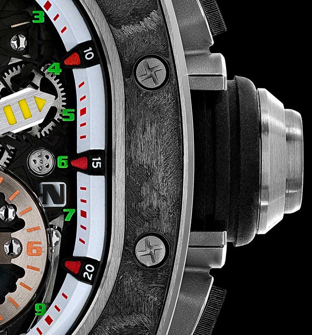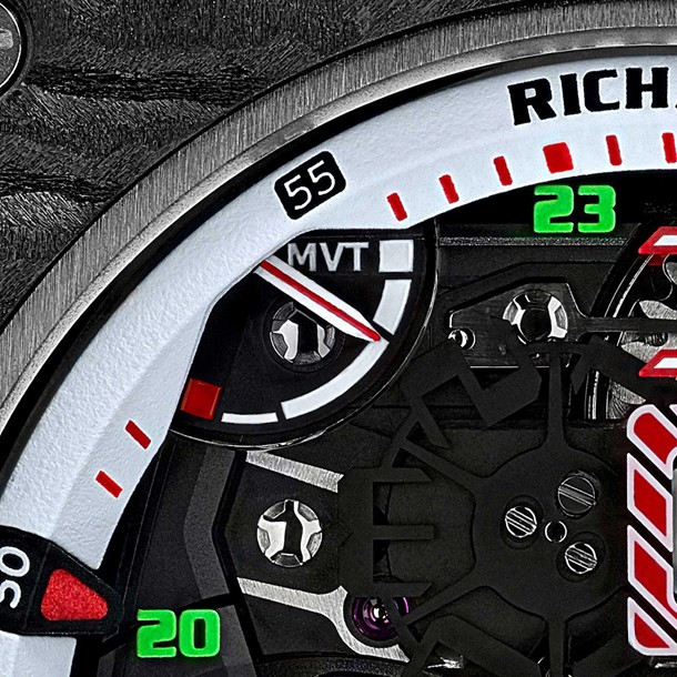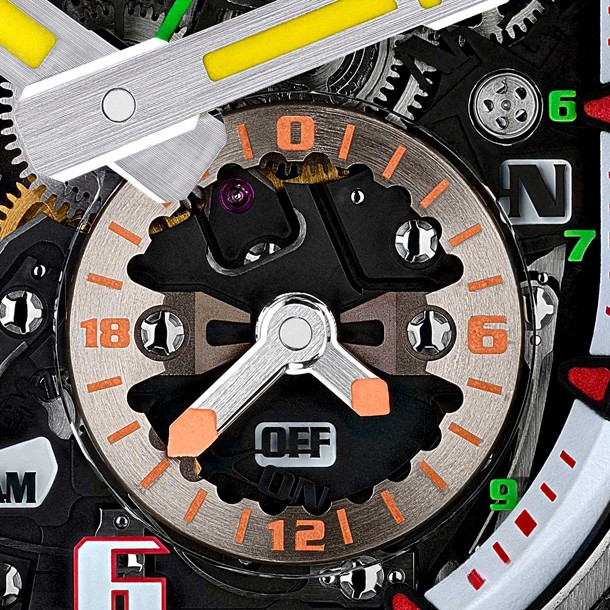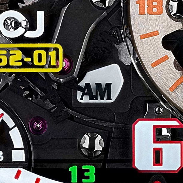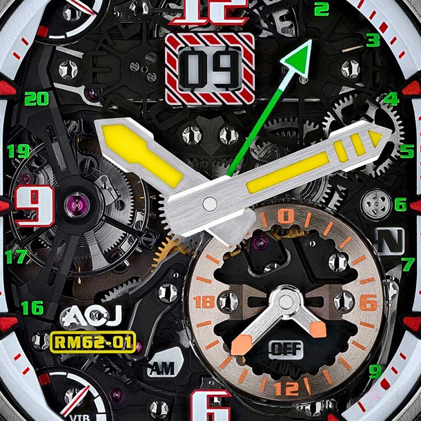 RM 62-01 Tourbillon Vibrating Alarm Airbus Corporate Jets - самая сложная на сегодняшний день модель Richard Mille с 816-ю деталями, 2 барабанами, 7 стрелками, 11-ю индикаторами и клетью турбийона. RM 62-01 представлены в корпусе из титана и карбона TPT® размером 42 x 50 x 16.9 мм. Калибр RM62-01 представляет собой механизм с ручным заводом, основание и мосты которого выполнены из титана 5 класса, обработанного черным PVD. На циферблате отображаются часы и минуты при помощи центральных стрелок. Зеленая стрелка UTC – это индикатор второго часового пояса. Вспомогательный циферблат между 4 и 5 часами можно использовать для установки функции будильника на ближайшую минуту из полных 24 часов. Индикатор запаса хода расположен на 11-ти часах. На 7-ми часах расположен индикатор, который отслеживает запас хода для будильника. Среди других индикаторов на циферблате RM 62-01: увеличенная дата, индикатор день/ночь, селектор функций и, конечно, индикатор включения/выключения будильника.Последняя вещь, о которой стоит упомянуть, - это заводная коронка, которая используется для выбора одного из пяти режимов регулировки: N (нейтральный) - W (завод) - T (установка времени) - U (ручная настройка UTC) - A (настройка будильника). Выбранный режим отображается на диске на 3-х часах. Часы Richard Mille RM 62-01 Tourbillon Vibrating Alarm Airbus Corporate Jets будут выпущены ограниченной серией 30 экземпляров.