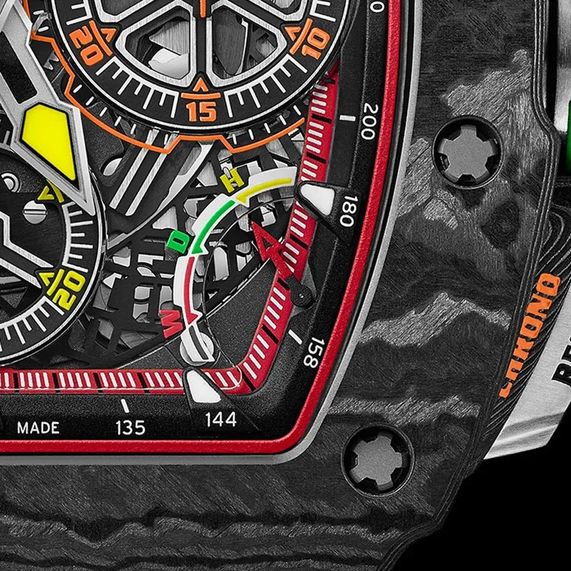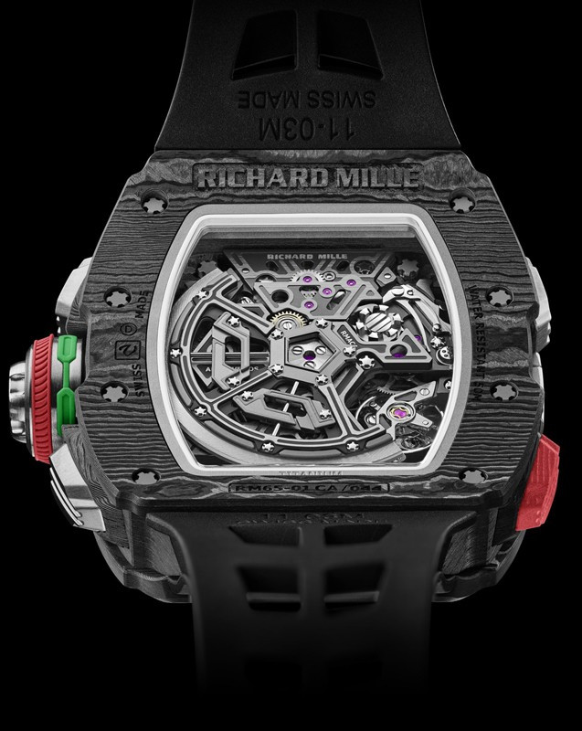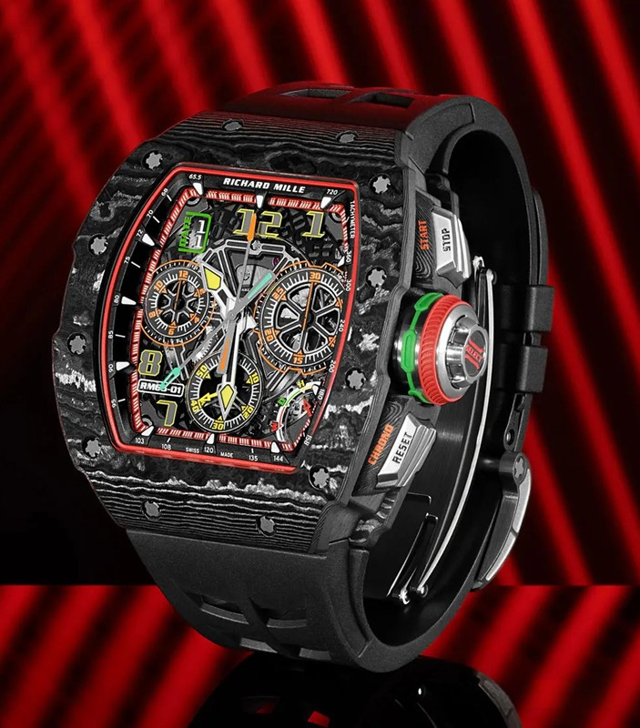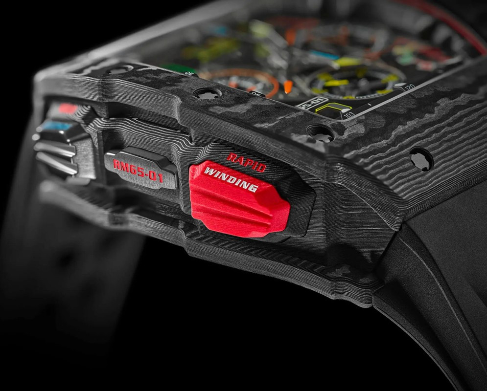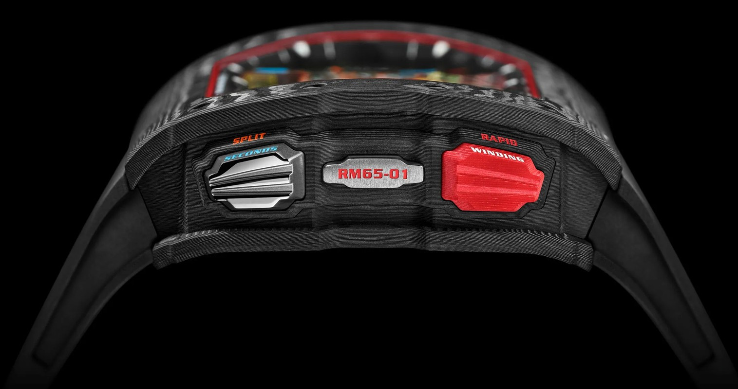 Часы Richard Mille RM 65-01 Automatic Split Seconds Chronograph представлены в корпусе из карбона размером 44.5 х 16.1 мм водонепроницаемостью 50 метров. Внутри корпуса установлен автоматический механизм, Калибр RMAC4, обладающий запасом хода 60 часов. На черном скелетированном циферблате отображаются часы, минуты, секунды, дата, индикатор выбора функций, тахиметр, накопители хронографа. Часы поставляются на каучуковом ремешке с титановой вставкой.