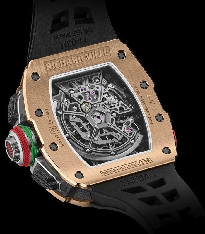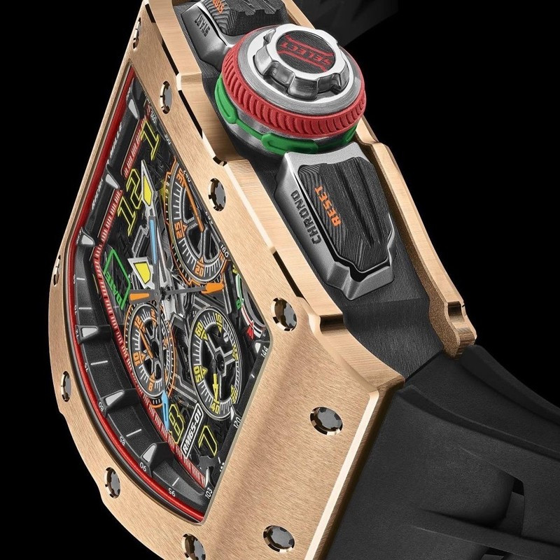 Часы Richard Mille RM 65-01 Automatic Split Seconds Chronograph представлены в корпусе из розового золота 18к и карбона размером 44.5 х 16.1 мм водонепроницаемостью 50 метров. Внутри корпуса установлен автоматический механизм, Калибр RMAC4, обладающий запасом хода 60 часов. На черном скелетированном циферблате отображаются часы, минуты, секунды, дата, индикатор выбора функций, тахиметр, накопители хронографа. Часы поставляются на каучуковом ремешке с золотой вставкой.