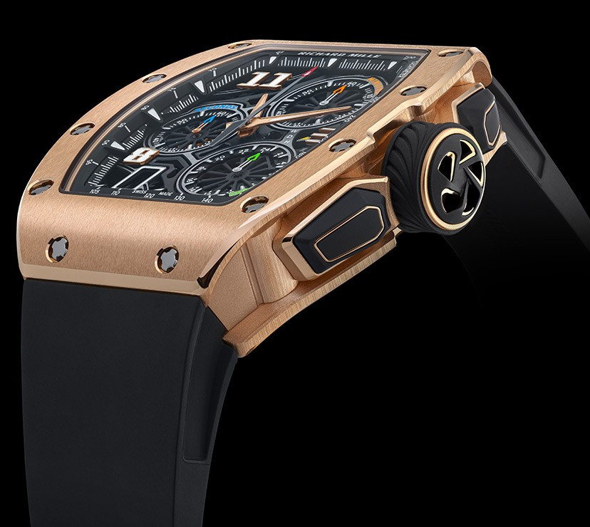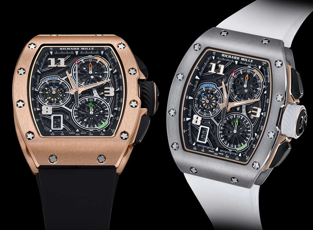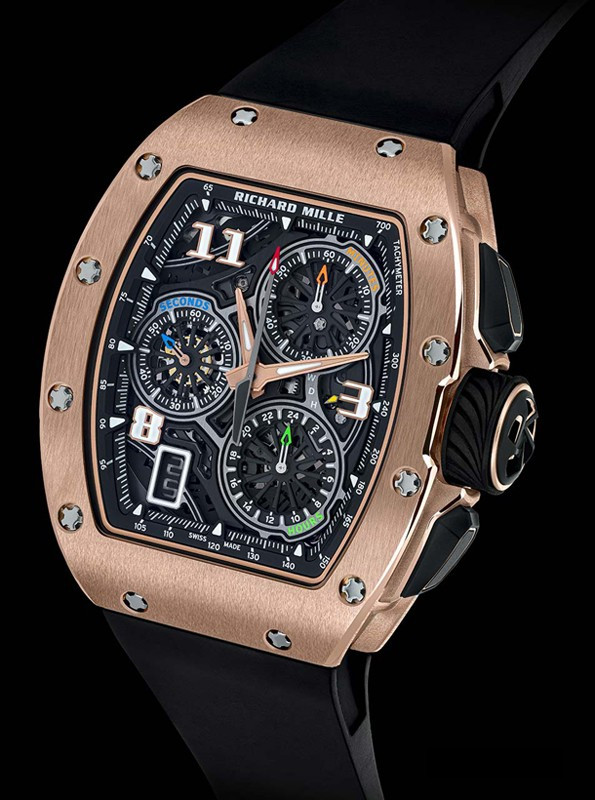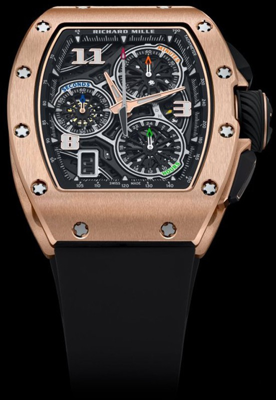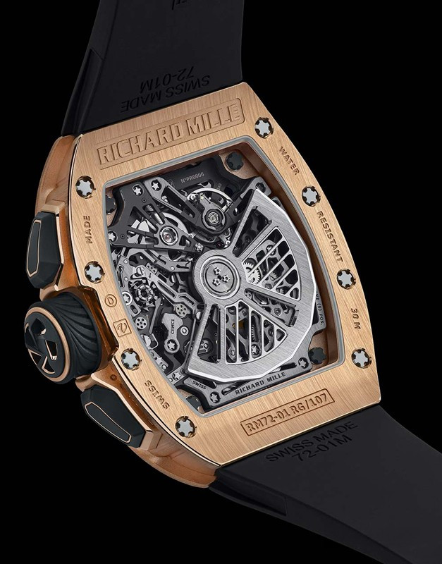 Часы Richard Mille RM 72-01 представлены в корпусе из розового золота 18к размером 38.4 x 47.34 x 11.68 мм водонепроницаемостью 30 метров. Внутри корпуса установлен автоматический механизм, Калибр CRMC1, обладающий запасом хода 50 часов. На черном скелетированном циферблате отображаются часы, минуты, секунды, дата, накопители хронографа. Часы поставляются на каучуковом ремешке с вставкой из розового золота 18к.