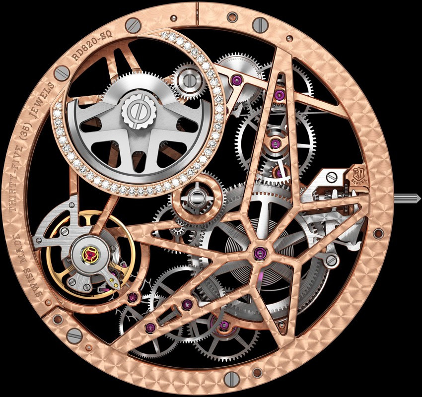 Часы Roger Dubuis Excalibur Automatic Skeleton представлены в корпусе размером 42 мм из розового золота 18к. На золотистом циферблате с белыми бриллиантами отображаются часы, минуты. Внутри корпуса установлен автоматический механизм, Калибр RD820SQ с запасом хода 60 часов. Часы поставляются на каучуковом ремешке с вставкой из розового золота 18к. Водонепроницаемость 50 метров. Корпус инкрустирован белыми бриллиантами. Серия ограничена - 28 штук.