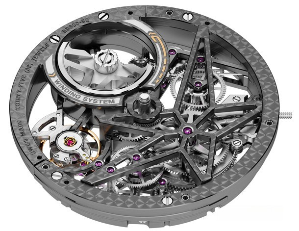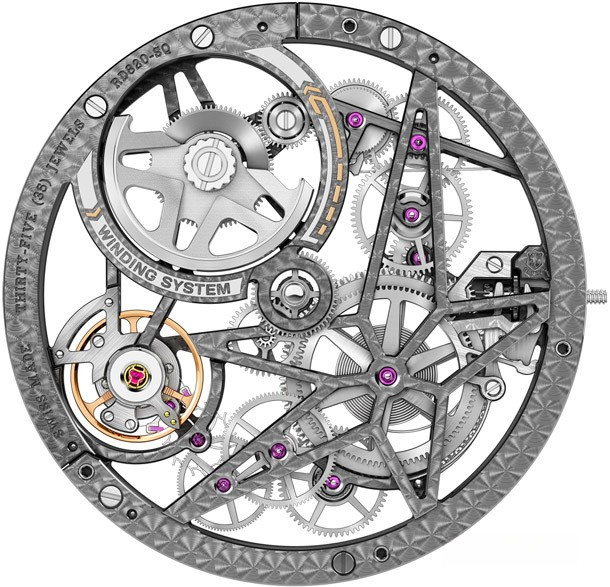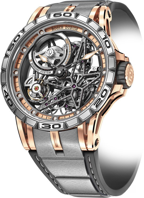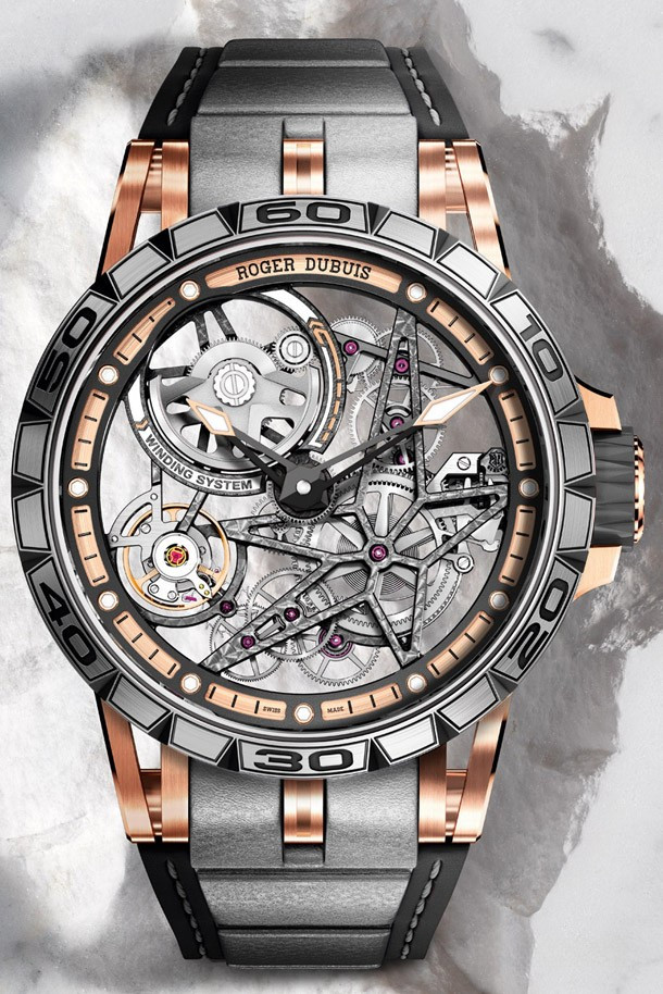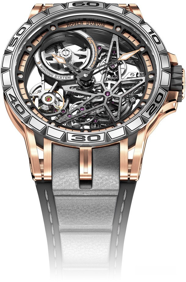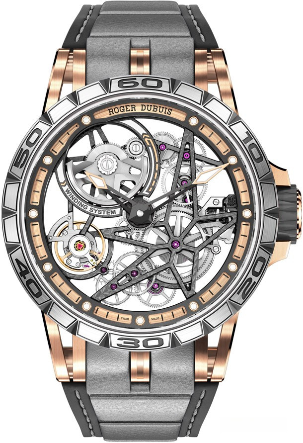Являясь синонимом современного, навеянного автомобильным спортом образа, нашедшего свое отражение в «технических скелетонах» Roger Dubuis, скелетон с автоматическим калибром Excalibur Spider представляет собой новое выражение таланта и гениальности «лидера инноваций в области современных скелетонов», показывающее его способность поднять это рукотворное произведение на уровень одной из форм современного искусства. Эта удивительно притягательная модель из розового золота, выпущенная лимитированной серией из 88 экземпляров, предлагает свою собственную интерпретацию насыщенного жизнью микрокосма технической и архитектурной механики. На фоне теплого свечения драгоценного металла гармонично смотрятся безель и задняя крышка из титана 5 класса, скелетонизированный верхний фланец из латуни с черным PVD-покрытием, черная минутная шкала в тон деталям из вулканизированного каучука на головке и корпусном кольце, а также розовые кончики стрелок. Тема контрастов также находит свое отражение в текстурах отделки, в частности, в полированных фасках и сатинированных боковых сторонах. Покрытие Super-LumiNova® на кончиках стрелок и накладных винтах на ободке циферблата обеспечивает оптимальную читаемость ночью и днем. Эффектный ремешок из сочетания нескольких материалов – каучуковой основы с серой вставкой из телячьей кожи и серой строчкой надежно фиксируется на руке при помощи раскладывающейся застежки из титана с черным алмазоподобным покрытием.