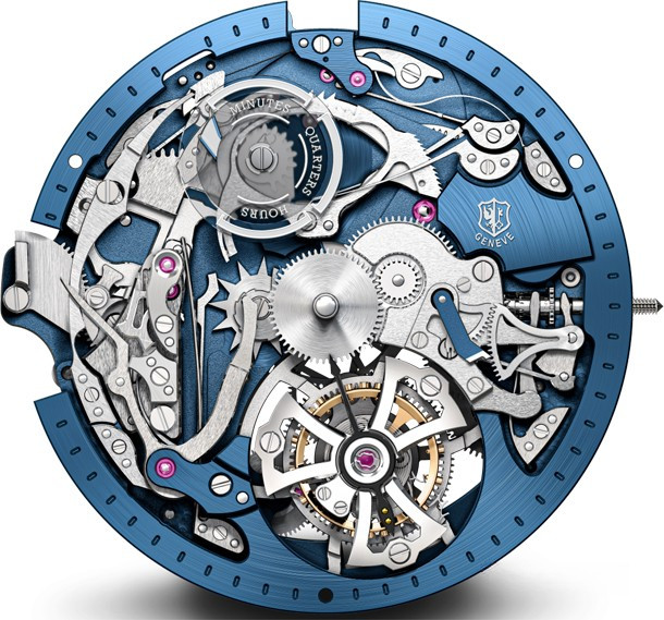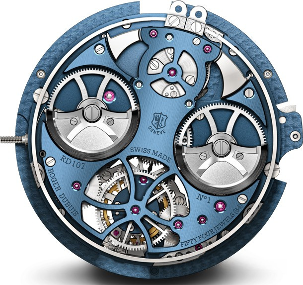 Часы Roger Dubuis Excalibur Diabolus in Machina представлены в корпусе из CarTech Micro-Melt BioDur CCMTM размером 45 х 16.8 мм водонепроницаемостью 30 метров. Внутри корпуса находится автоматический механизм, Калибр RD0107, обладающий запасом хода 60 часов. На синем с серебристым циферблате отображаются часы, минуты, дата, индикатор функций и боя. Часы поставляются на кожаном ремешке с титановой вставкой. Серия ограничена - 1 шт.