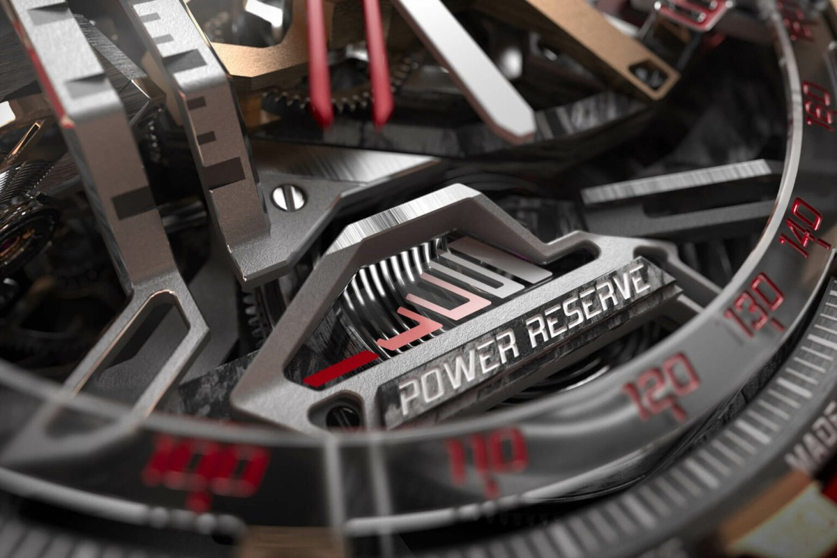 Часы Roger Dubuis Excalibur Monovortex Split Seconds Chronograph представлены в корпусе размером 47 мм из карбона и розового золота 18к водонепроницаемостью 100 метров. Внутри корпуса установлен механизм с ручным заводом, Калибр RD114, обладающий запасом хода 48 часов. На сером циферблате отображаются часы, минуты, секунды. Часы поставляются на каучуковом ремешке с титановой застежкой.