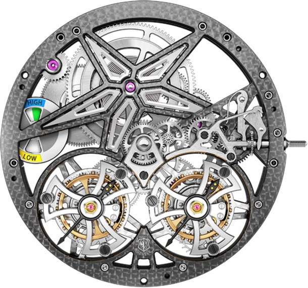 Эксклюзивное сотрудничество с группой Pirelli, известной своими техническими и индустриальными инновациями, являющейся единственным поставщиком шин премиум?класса для ведущих мировых соревнований по автомотоспорту. Помимо знаменитой цветовой маркировки Pirelli, сюрпризом становится ремешок с резиновыми вставками из сертифицированных шин Pirelli, на внутреннюю поверхность которого нанесен легендарный рисунок протектора шины Pirelli Cinturato™ Intermediate, а на внешнюю — Pirelli Sottozero. Поклонники точной механики могут насладиться неповторимым видом просматривающегося насквозь нового калибра RD105SQ с ручным заводом, индикатором запаса хода и знаковой архитектурой Astral Skeleton в синем цвете. Парящие турбийоны у 5? и 7?часовой отметок заключены в секундные счетчики, оформленные в виде автомобильных спидометров и снабженные соответствующими стрелками. Многоцветный индикатор запаса хода отчетливо напоминает указатель уровня топлива в кокпите гоночной машины. Счастливые обладатели часов этой лимитированной серии из 8 экземпляров не только насладятся характерным обликом линейки Pirelli, связывающим их часы с историческими победами в автогонках, но и получат возможность присутствовать на местных соревнованиях топ?уровня, проводимых с участием Pirelli.