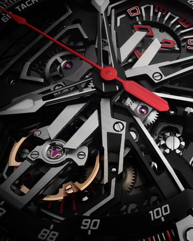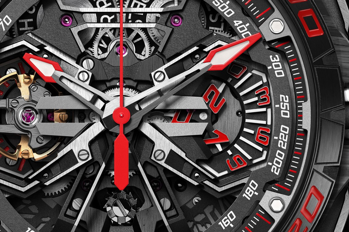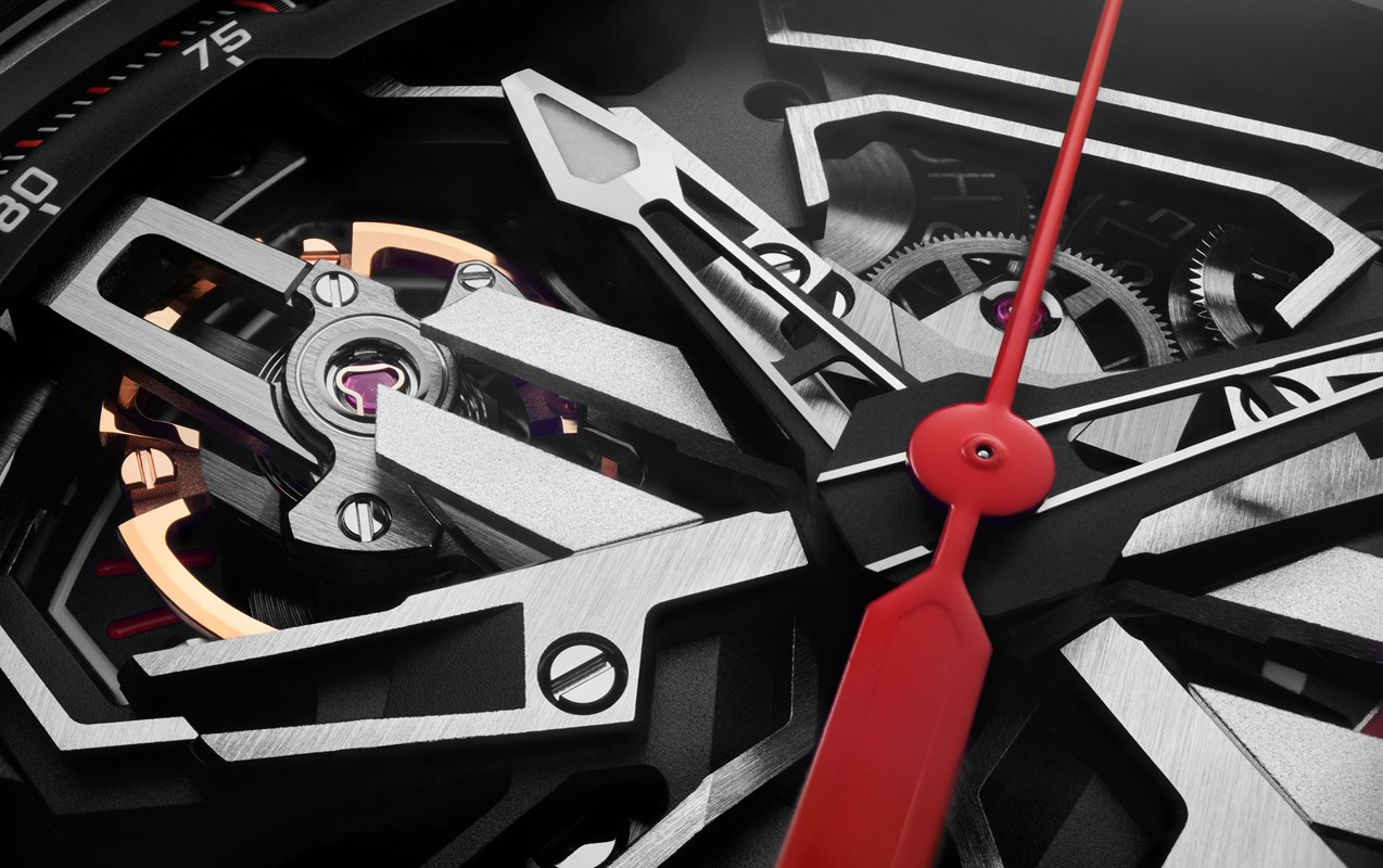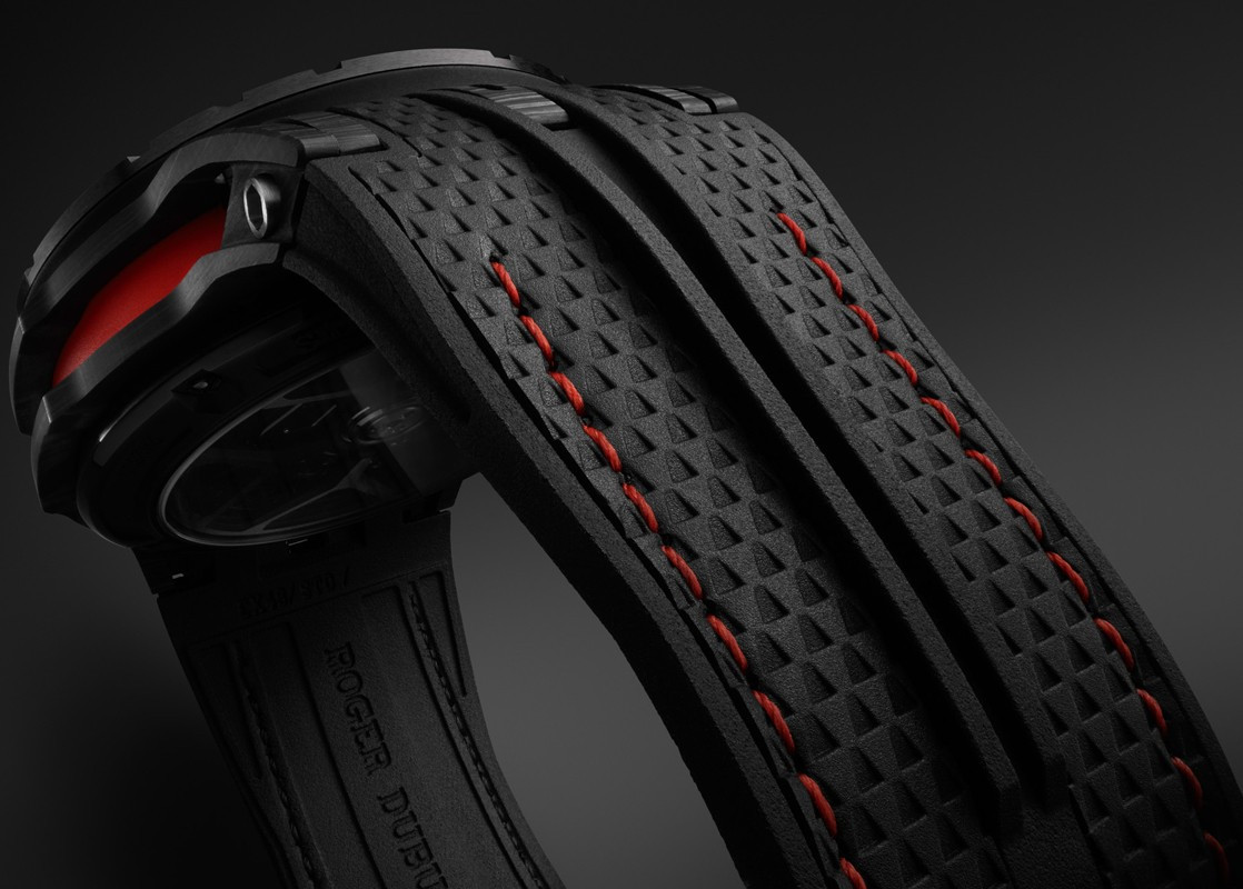 Часы Roger Dubuis Excalibur Spider Flyback Chronograph представлены в корпусе размером 45 х 16.1 мм из карбона и керамики водонепроницаемостью 100 метров. Внутри корпуса установлен автоматический механизм, Калибр RD780, обладающий запасом хода 72 часа. На черном циферблате отображаются часы, минуты, секунды, дата, накопители хронографа. Часы поставляются на каучуковом ремешке с титановой застежкой.