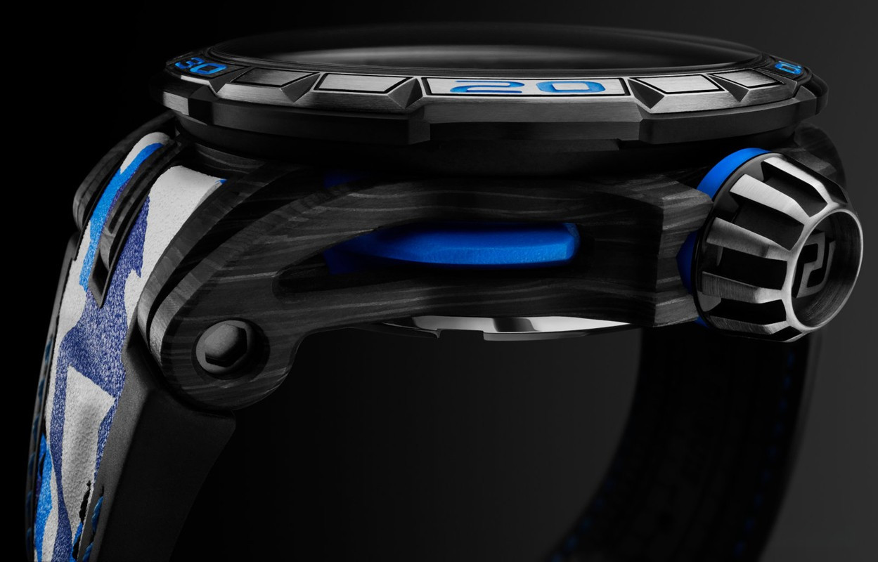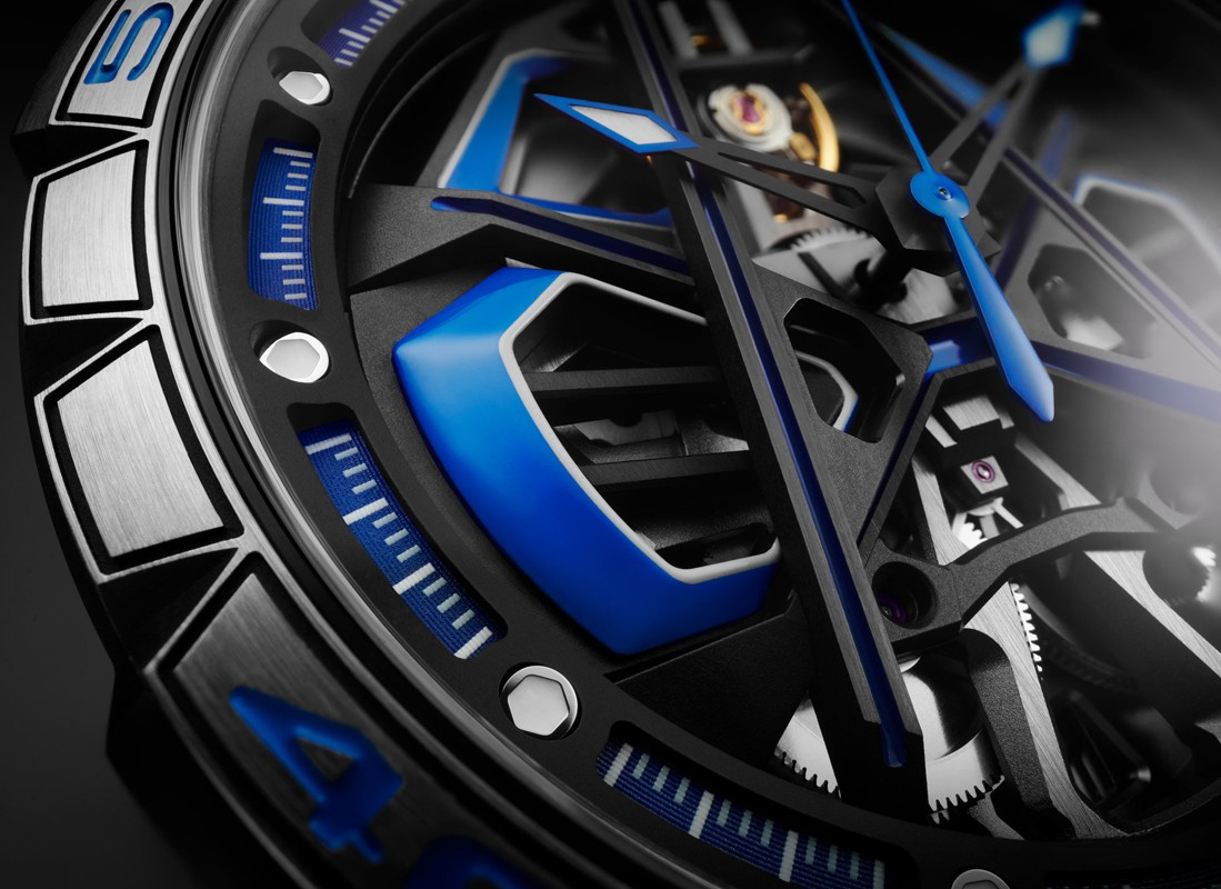 Часы Roger Dubuis Excalibur Spider Huracan Monobalancier представлены в корпусе из титана с покрытием DLC размером 45 х 14.1 мм водонепроницаемостью 50 метров. Внутри корпуса находится автоматический механизм, Калибр RD630, обладающий запасом хода 60 часов. На синем циферблате отображаются часы, минуты, секунды, дата. Часы поставляются на каучуковом ремешке с титановой застежкой. Серия ограничена - 28 шт.