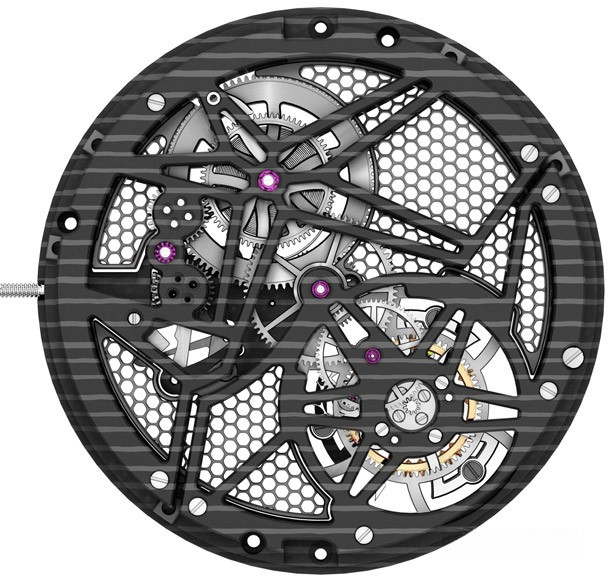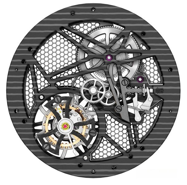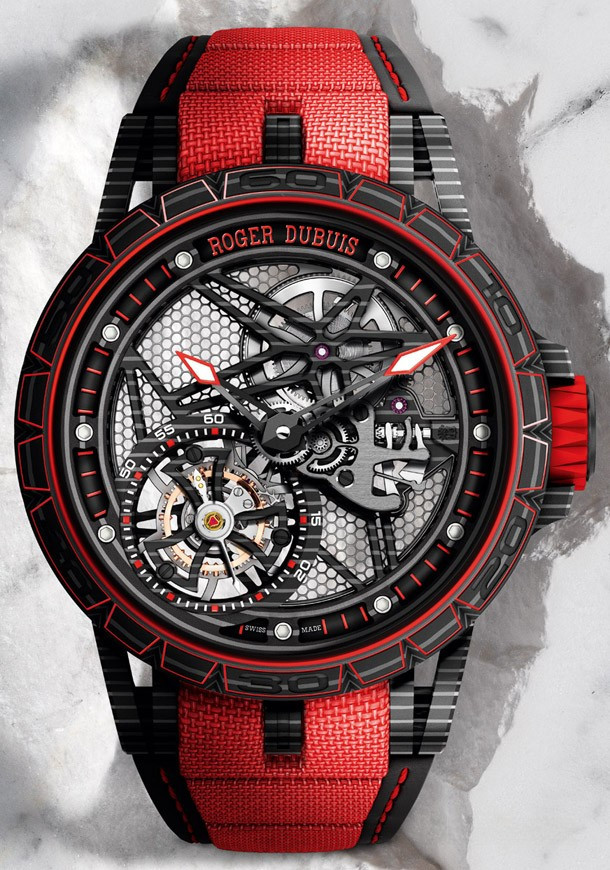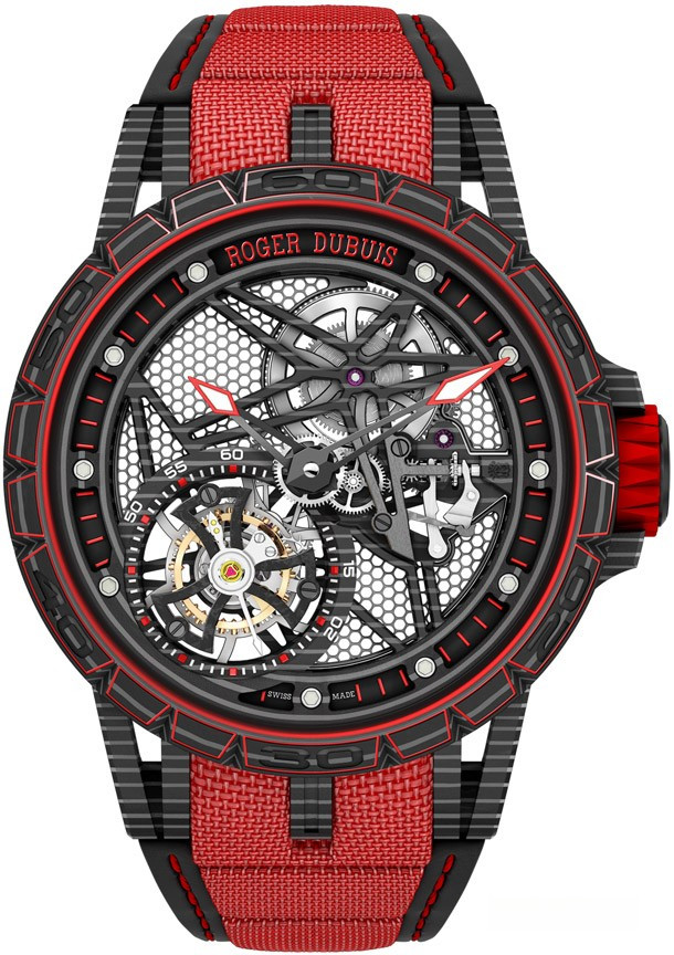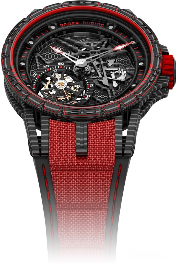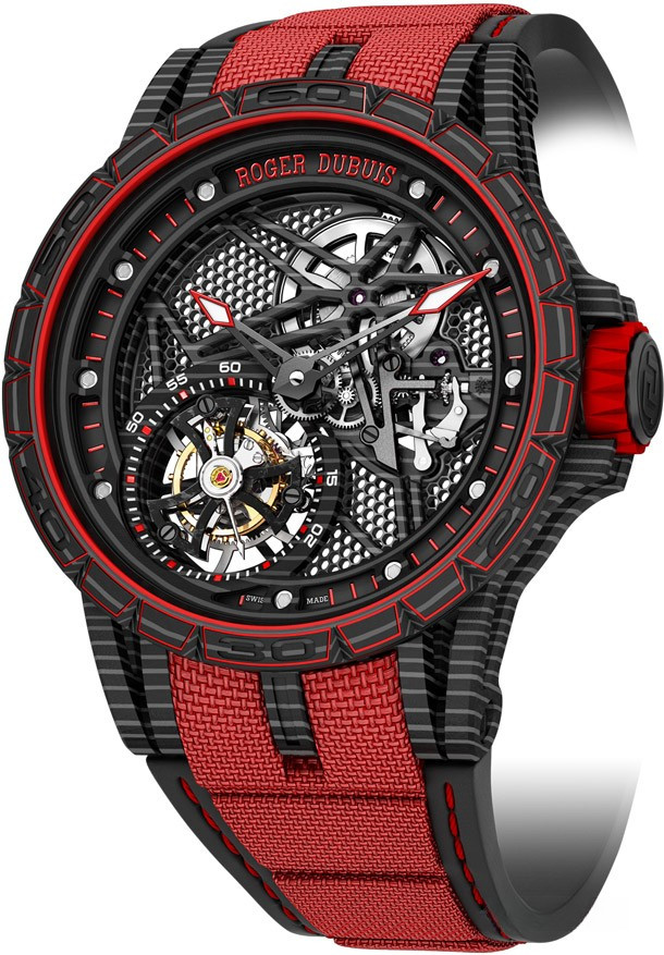 Roger Dubuis представили громкую мировую премьеру часов Excalibur Spider — Карбон. Эффектная модель в черных и красных тонах заключена в скелетонизированный корпус Spider с титановой заводной головкой (с алмазоподобным покрытием), задней крышкой и корпусным кольцом. Этот легкий, но устойчивый к нагрузкам материал дополняется многослойным карбоном, из которого сделан сам корпус, а также вулканизированным каучуком на корпусном кольце и красным лаком, выделяющим безель. Особенно примечательно использование в этих часах первых в истории полностью карбоновых платины калибра, мостов и верхней каретки турбийона. Благодаря этому остов, образуемый платиной и корпусом, оказывается необыкновенно легким. Узор «пчелиные соты» на циферблате, напоминающий решетку радиатора автомобиля, создает идеальный высокотехнологичный фон для калибра RD509SQ Astral Skeleton с парящим турбийоном, работающего с частотой 21 600 полуколебаний в час и обладающего запасом хода 70 часов.