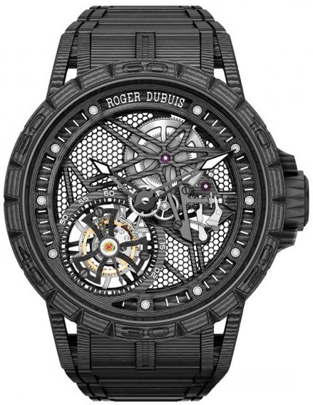 Эффектная модель Roger Dubuis Excalibur Spider Skeleton Flying Tourbillon в черных тонах заключена в скелетонизированный корпус Spider из карбона. Особенно примечательно использование в этих часах карбоновых платины Калибра, мостов и верхней каретки турбийона. Благодаря этому остов, образуемый платиной и корпусом, оказывается необыкновенно легким. Калибр RD509SQ с парящим турбийоном работает с частотой 21 600 полуколебаний в час и обладает запасом хода 90 часов. Диаметр корпуса составляет 45 мм, водонепроницаемость 50 метров. Часы выпущены ограниченной серией 28 штук.