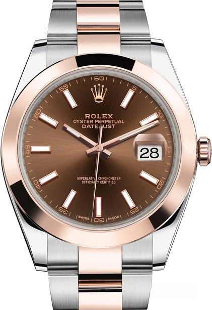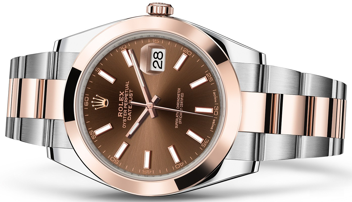 Новая модель Datejust 41 представлена в версии из золота Everose и нержавеющей стали с коричневым циферблатом. Модель Datejust – настоящий эталон классических наручных часов как в отношении дизайна, над которым время не властно, так и по своим техническим характеристикам. Для проверки показателей точности хода часов в процессе эксплуатации компания Ролекс тестирует часы в собранном виде, что позволяет гарантировать их исключительные характеристики в ходе ношения в том, что касается точности, водонепроницаемости, автоматического подзавода и запаса хода. Автоматический механизм обеспечивает 70-часовой запас хода и поддерживает функции часов, минут, секунд и даты. Часы комплектуются браслетом из нержавеющей стали и розового золота.