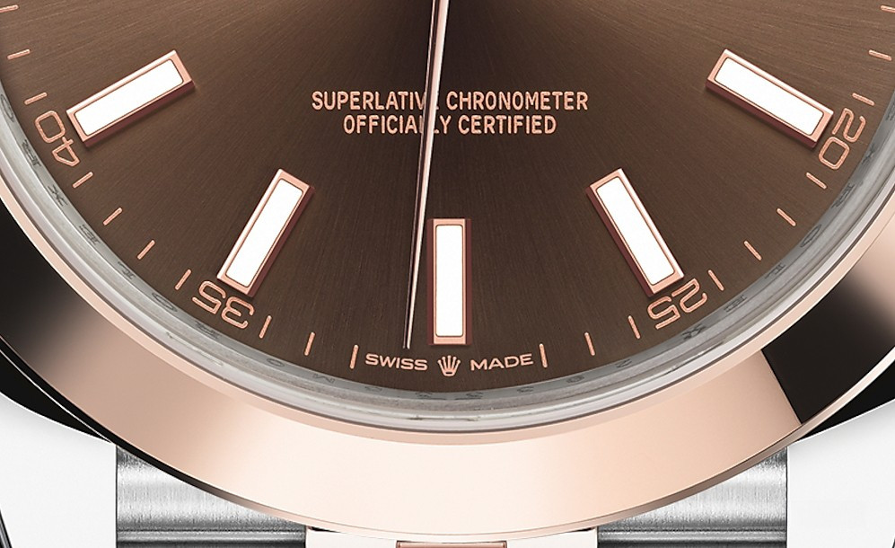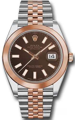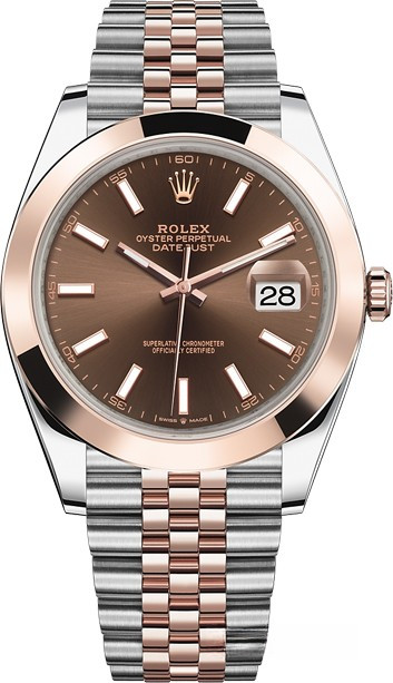 Новая модель Datejust 41 представлена в версии из золота Everose и нержавеющей стали с коричневым циферблатом. Модель Datejust – настоящий эталон классических наручных часов как в отношении дизайна, над которым время не властно, так и по своим техническим характеристикам. Для проверки показателей точности хода часов в процессе эксплуатации компания Ролекс тестирует часы в собранном виде, что позволяет гарантировать их исключительные характеристики в ходе ношения в том, что касается точности, водонепроницаемости, автоматического подзавода и запаса хода. Автоматический механизм обеспечивает 70-часовой запас хода и поддерживает функции часов, минут, секунд и даты. Часы комплектуются браслетом из нержавеющей стали и розового золота.