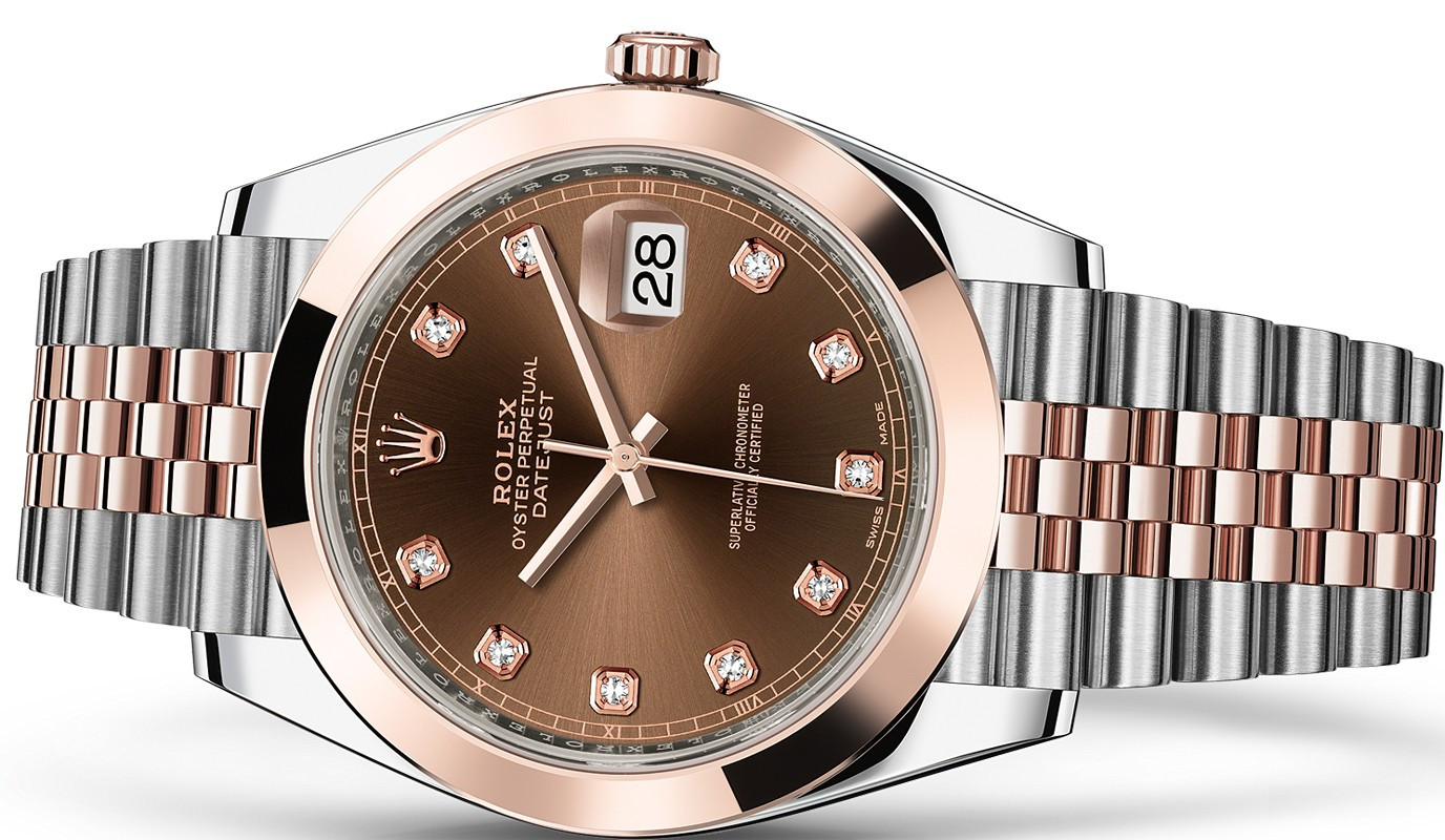 Новая модель Datejust 41 представлена в версии из золота Everose и нержавеющей стали с коричневым циферблатом и 10-ю белыми бриллиантами. Модель Datejust – настоящий эталон классических наручных часов как в отношении дизайна, над которым время не властно, так и по своим техническим характеристикам. Для проверки показателей точности хода часов в процессе эксплуатации компания Ролекс тестирует часы в собранном виде, что позволяет гарантировать их исключительные характеристики в ходе ношения в том, что касается точности, водонепроницаемости, автоматического подзавода и запаса хода. Автоматический механизм обеспечивает 70-часовой запас хода и поддерживает функции часов, минут, секунд и даты. Часы комплектуются браслетом из нержавеющей стали и розового золота.