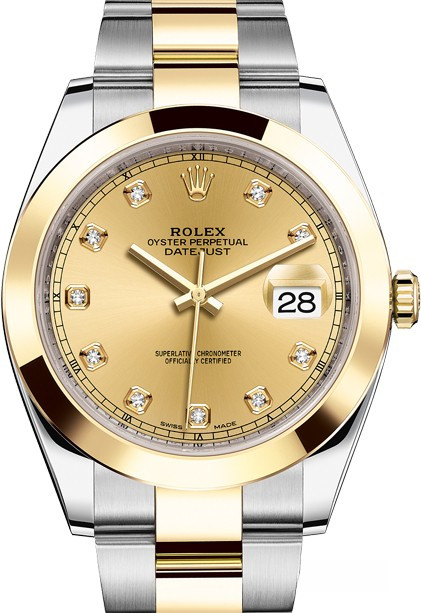 Новая модель Datejust 41 представлена в версии из желтого золота и нержавеющей стали с золотистым циферблатом и 10-ю белыми бриллиантами. Модель Datejust – настоящий эталон классических наручных часов как в отношении дизайна, над которым время не властно, так и по своим техническим характеристикам. Для проверки показателей точности хода часов в процессе эксплуатации компания Ролекс тестирует часы в собранном виде, что позволяет гарантировать их исключительные характеристики в ходе ношения в том, что касается точности, водонепроницаемости, автоматического подзавода и запаса хода. Автоматический механизм обеспечивает 70-часовой запас хода и поддерживает функции часов, минут, секунд и даты. Часы комплектуются браслетом из нержавеющей стали и желтого золота.