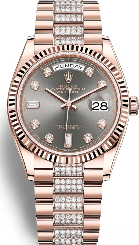 Водостойкие часы Rolex Day-Date Day-Date 36mm Everose Gold являются официально сертифицированным хронометром COSC, выпущены в круглом корпусе из розового золота 18к. Размер составляет 36 мм, водонепроницаемость 100 м. Внутри корпуса установлен автоматический механизм. На сером циферблате с 10-ю белыми бриллиантами отображаются часы, минуты, секунды, дата, день недели. Часы комплектуются браслетом из розового золота 18к, инкрустированным белыми бриллиантами.