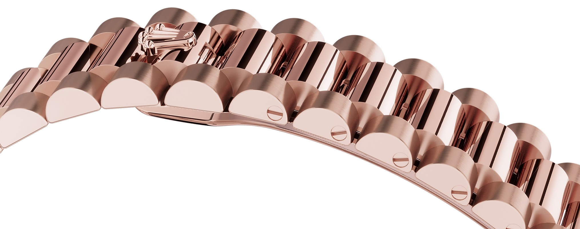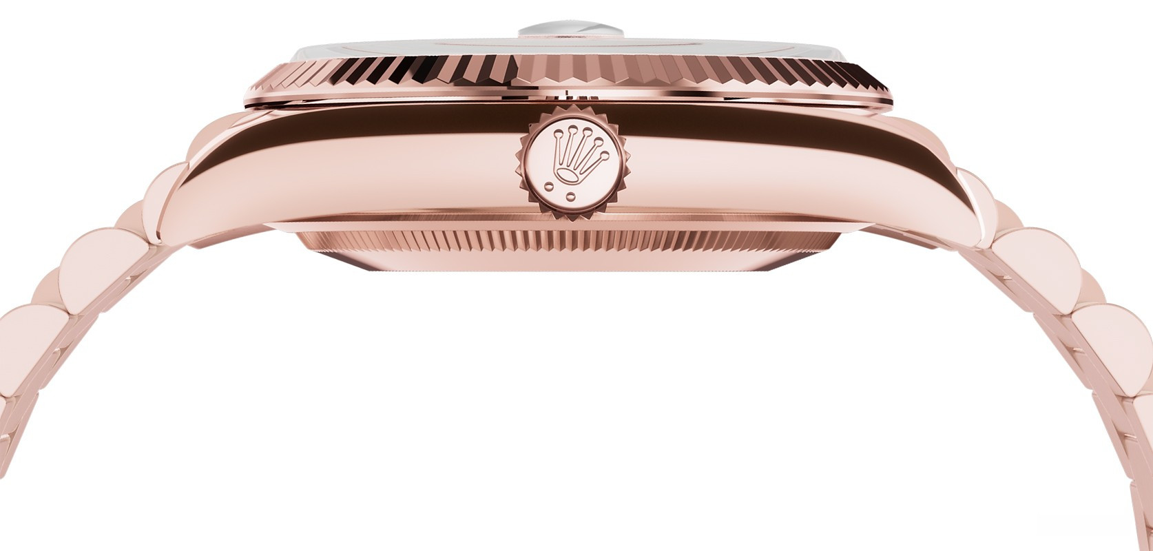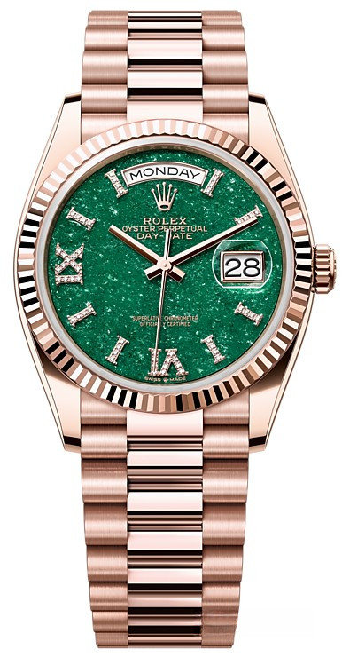 Водостойкие часы Rolex Day-Date 36mm Everose Gold являются официально сертифицированным хронометром COSC, выпущены в круглом корпусе из розового золота 18к. Размер составляет 36 мм, водонепроницаемость 100 м. Внутри корпуса установлен автоматический механизм. На циферблате из зеленого авантюрина с белыми бриллиантами отображаются часы, минуты, секунды, дата, день недели. Часы комплектуются браслетом из розового золота 18к.