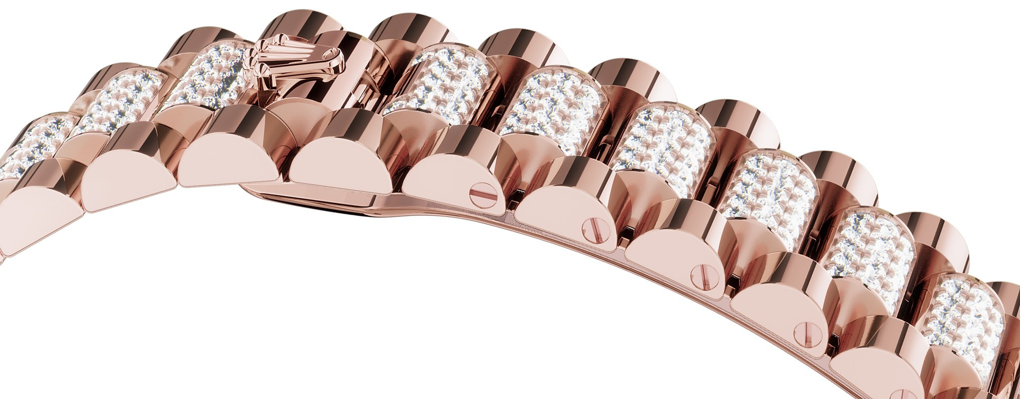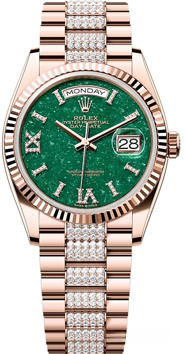 Водостойкие часы Rolex Day-Date 36mm Everose Gold являются официально сертифицированным хронометром COSC, выпущены в круглом корпусе из розового золота 18к. Размер составляет 36 мм, водонепроницаемость 100 м. Внутри корпуса установлен автоматический механизм. На циферблате из зеленого авантюрина с белыми бриллиантами отображаются часы, минуты, секунды, дата, день недели. Часы комплектуются браслетом из розового золота 18к, инкрустированным белыми бриллиантами.