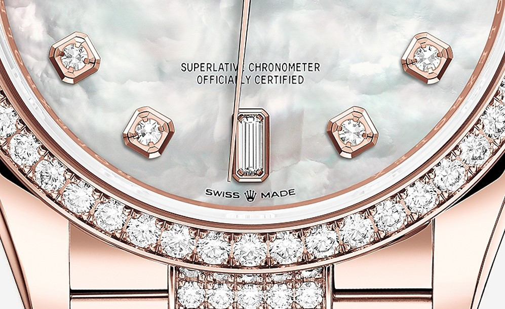 Водостойкие часы Rolex Day-Date Day-Date 36mm Everose Gold являются официально сертифицированным хронометром COSC, выпущены в круглом корпусе из розового золота 18к. Размер составляет 36 мм, водонепроницаемость 100 м. Внутри корпуса установлен автоматический механизм. На белом жемчужном циферблате с 10-ю белыми бриллиантами отображаются часы, минуты, секунды, дата, день недели. Часы комплектуются браслетом из розового золота 18к, инкрустированным белыми бриллиантами. Безель из белых бриллиантов.