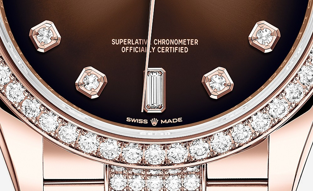 Водостойкие часы Rolex Day-Date Day-Date 36mm Everose Gold являются официально сертифицированным хронометром COSC, выпущены в круглом корпусе из розового золота 18к. Размер составляет 36 мм, водонепроницаемость 100 м. Внутри корпуса установлен автоматический механизм. На коричневом циферблате с 10-ю белыми бриллиантами отображаются часы, минуты, секунды, дата, день недели. Часы комплектуются браслетом из розового золота 18к, инкрустированным белыми бриллиантами. Безель из белых бриллиантов.