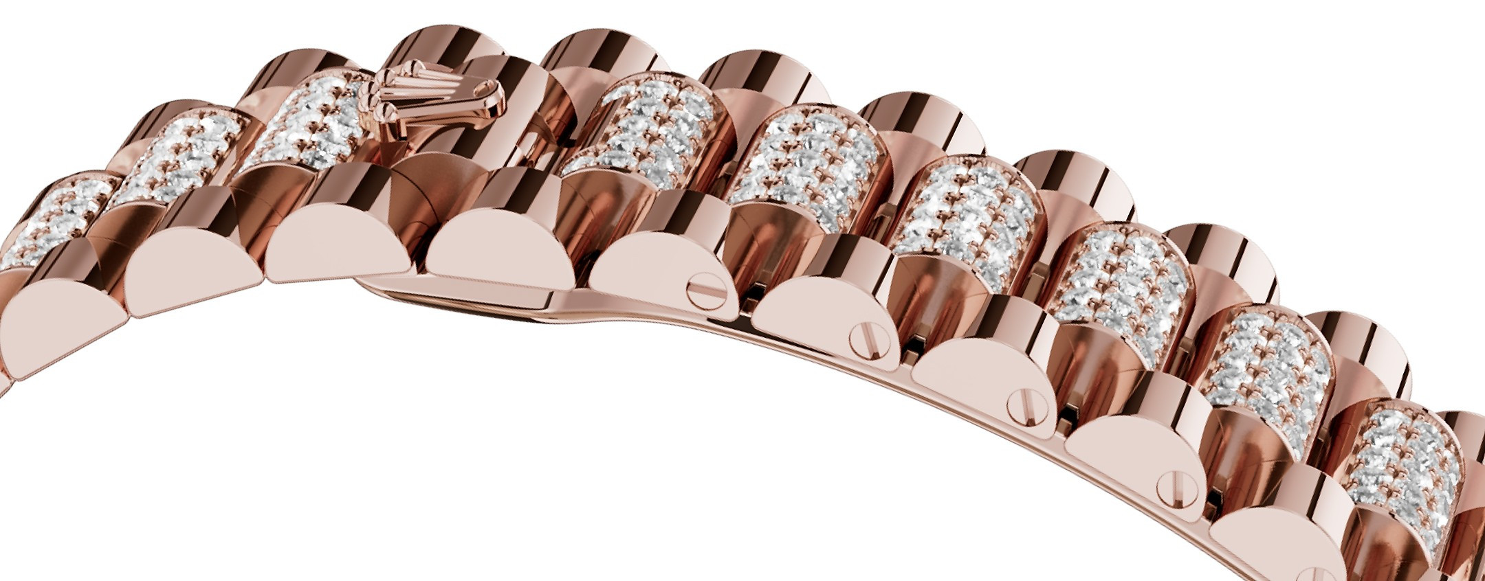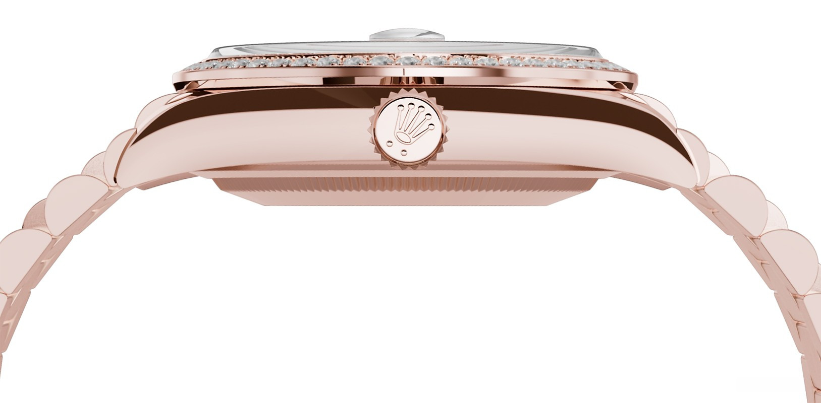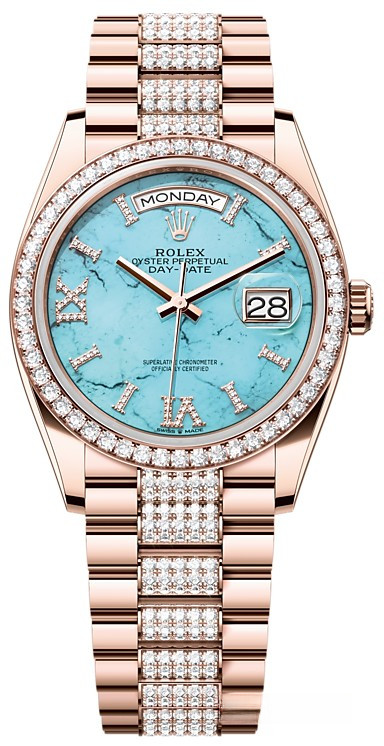 Водостойкие часы Rolex Day-Date 36mm Everose Gold являются официально сертифицированным хронометром COSC, выпущены в круглом корпусе из розового золота 18к. Размер составляет 36 мм, водонепроницаемость 100 м. Внутри корпуса установлен автоматический механизм. На циферблате из бирюзы с белыми бриллиантами отображаются часы, минуты, секунды, дата, день недели. Часы комплектуются браслетом из розового золота 18к,инкрустированным белыми бриллиантами. Безель из белых бриллиантов.