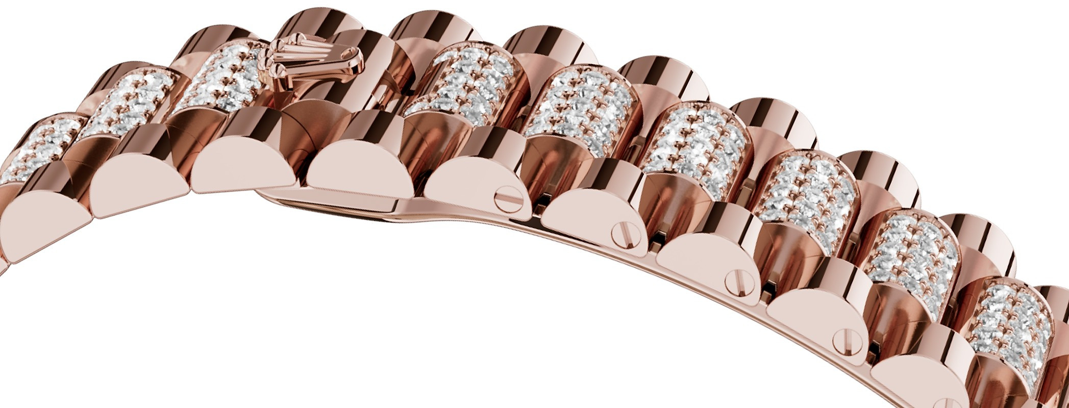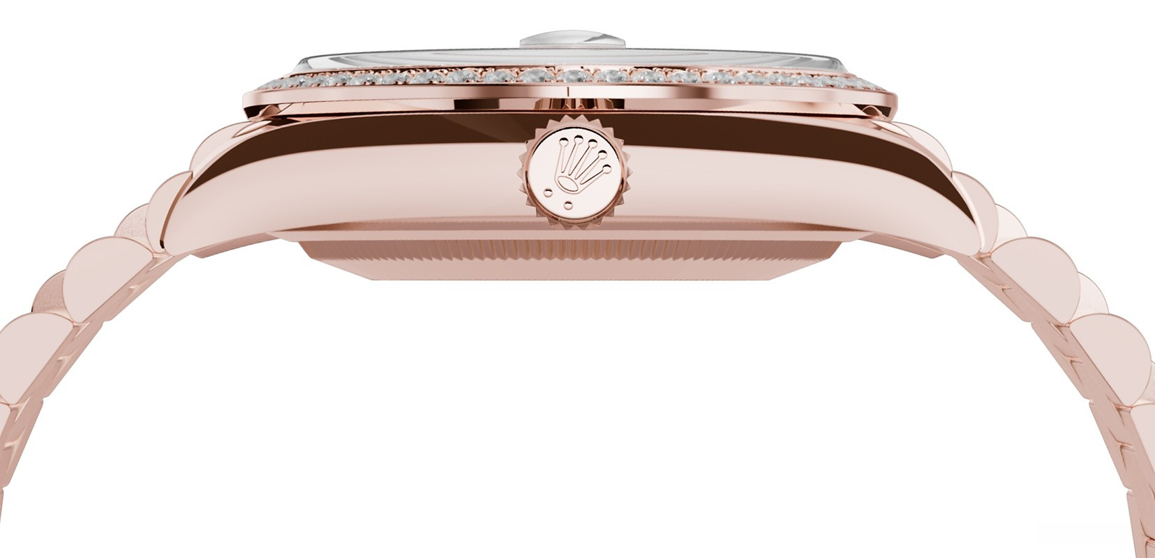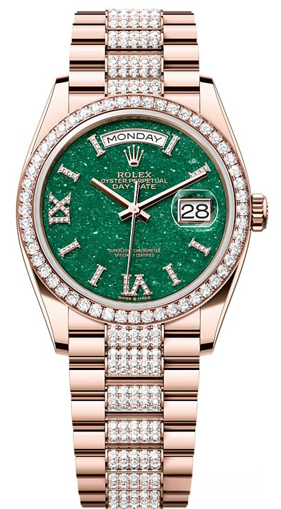 Водостойкие часы Rolex Day-Date 36mm Everose Gold являются официально сертифицированным хронометром COSC, выпущены в круглом корпусе из розового золота 18к. Размер составляет 36 мм, водонепроницаемость 100 м. Внутри корпуса установлен автоматический механизм. На циферблате из зеленого авантюрина с белыми бриллиантами отображаются часы, минуты, секунды, дата, день недели. Часы комплектуются браслетом из розового золота 18к, инкрустированным белыми бриллиантами. Безель из белых бриллиантов.