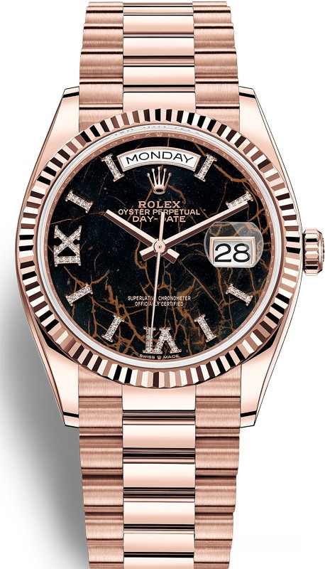 Водостойкие часы Rolex Day-Date Day-Date 36mm Everose Gold являются официально сертифицированным хронометром COSC, выпущены в круглом корпусе из розового золота 18к. Размер составляет 36 мм, водонепроницаемость 100 м. Внутри корпуса установлен автоматический механизм. На черном циферблате с белыми бриллиантами отображаются часы, минуты, секунды, дата, день недели. Часы комплектуются браслетом из розового золота 18к.