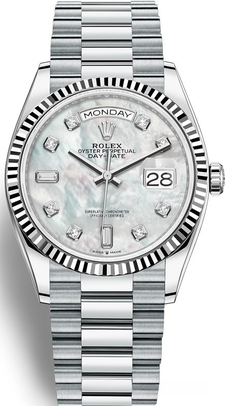 Водостойкие часы Rolex Day-Date Day-Date 36mm Platinum являются официально сертифицированным хронометром COSC, выпущены в круглом корпусе из платины 950. Размер составляет 36 мм, водонепроницаемость 100 м. Внутри корпуса установлен автоматический механизм, Калибр 3255, обладающий запасом хода 70 часов. На белом жемчужном циферблате с 10-ю белыми бриллиантами отображаются часы, минуты, секунды, дата, день недели. Часы комплектуются браслетом из платины 950.
