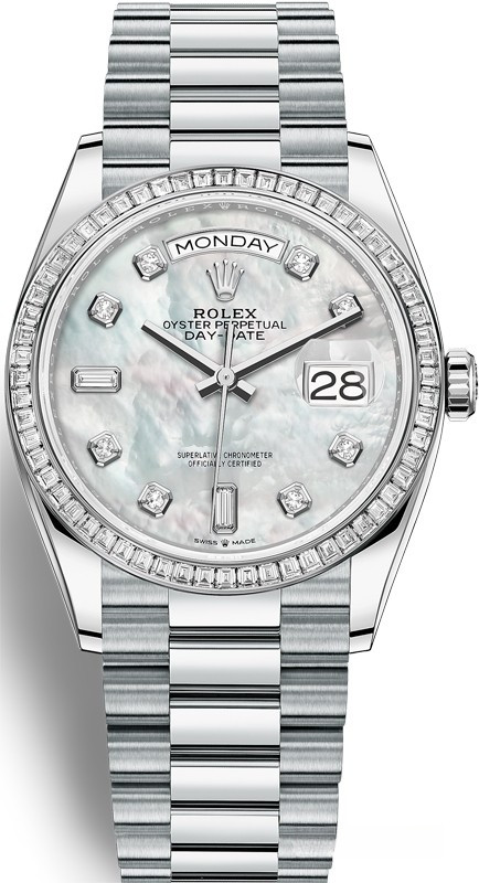 Водостойкие часы Rolex Day-Date Day-Date 36mm Platinum являются официально сертифицированным хронометром COSC, выпущены в круглом корпусе из платины 950. Размер составляет 36 мм, водонепроницаемость 100 м. Внутри корпуса установлен автоматический механизм, Калибр 3255, обладающий запасом хода 70 часов. На белом жемчужном циферблате с 10-ю белыми бриллиантами отображаются часы, минуты, секунды, дата, день недели. Часы комплектуются браслетом из платины 950. Безель из белых бриллиантов.