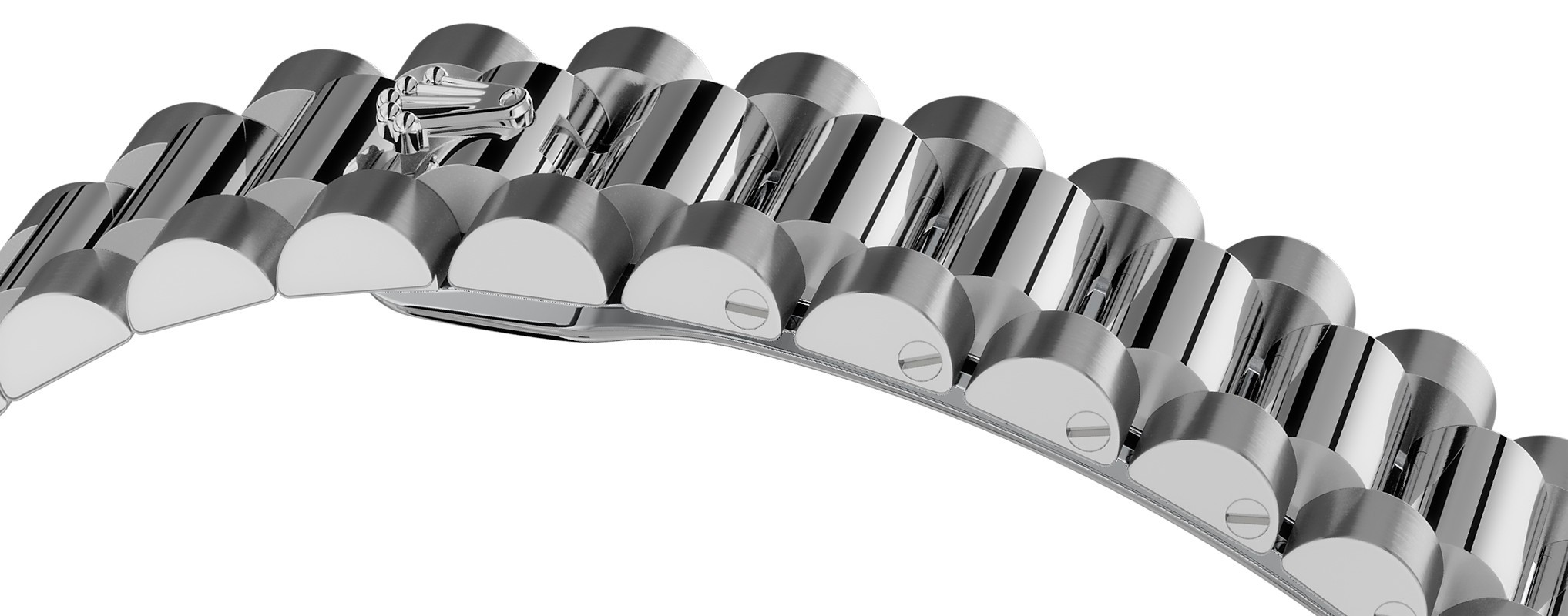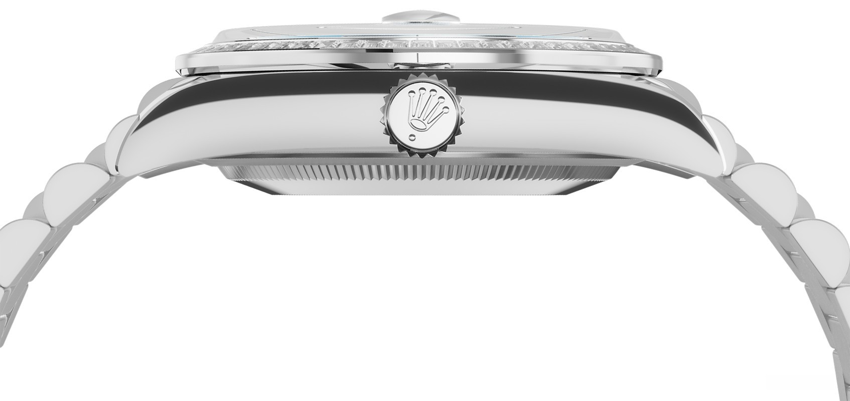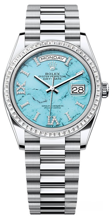Водостойкие часы Rolex Day-Date 36mm Platinum являются официально сертифицированным хронометром COSC, выпущены в круглом корпусе из платины 950. Размер составляет 36 мм, водонепроницаемость 100 м. Внутри корпуса установлен автоматический механизм, Калибр 3255, обладающий запасом хода 70 часов. На циферблате из бирюзы с белыми бриллиантами отображаются часы, минуты, секунды, дата, день недели. Часы комплектуются браслетом из платины 950. Безель из белых бриллиантов.