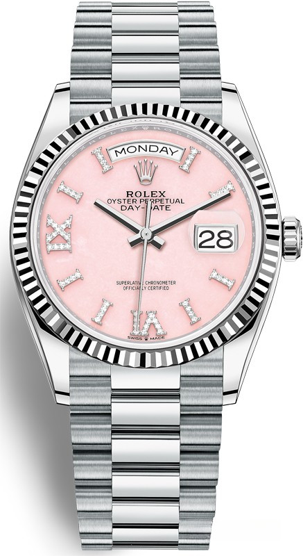 Водостойкие часы Rolex Day-Date Day-Date 36mm Platinum являются официально сертифицированным хронометром COSC, выпущены в круглом корпусе из платины 950. Размер составляет 36 мм, водонепроницаемость 100 м. Внутри корпуса установлен автоматический механизм, Калибр 3255, обладающий запасом хода 70 часов. На розовом циферблате с белыми бриллиантами отображаются часы, минуты, секунды, дата, день недели. Часы комплектуются браслетом из платины 950.