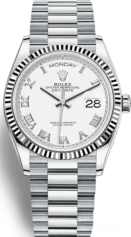 Водостойкие часы Rolex Day-Date Day-Date 36mm Platinum являются официально сертифицированным хронометром COSC, выпущены в круглом корпусе из платины 950. Размер составляет 36 мм, водонепроницаемость 100 м. Внутри корпуса установлен автоматический механизм, Калибр 3255, обладающий запасом хода 70 часов. На белом циферблате отображаются часы, минуты, секунды, дата, день недели. Часы комплектуются браслетом из платины 950.