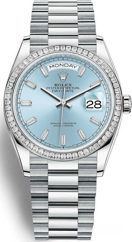 Водостойкие часы Rolex Day-Date Day-Date 36mm Platinum являются официально сертифицированным хронометром COSC, выпущены в круглом корпусе из платины 950. Размер составляет 36 мм, водонепроницаемость 100 м. Внутри корпуса установлен автоматический механизм, Калибр 3255, обладающий запасом хода 70 часов. На голубом циферблате с 10-ю белыми багетными бриллиантами отображаются часы, минуты, секунды, дата, день недели. Часы комплектуются браслетом из платины 950. Безель из белых бриллиантов.