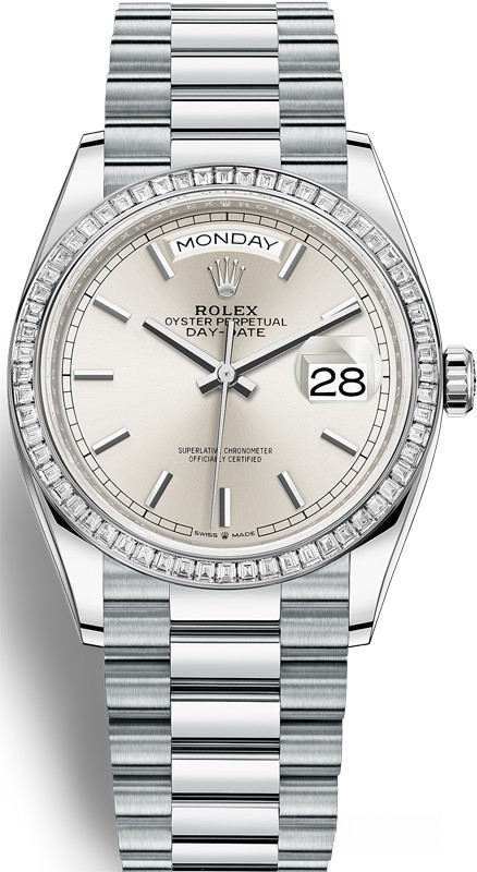 Водостойкие часы Rolex Day-Date Day-Date 36mm Platinum являются официально сертифицированным хронометром COSC, выпущены в круглом корпусе из платины 950. Размер составляет 36 мм, водонепроницаемость 100 м. Внутри корпуса установлен автоматический механизм, Калибр 3255, обладающий запасом хода 70 часов. На серебристом циферблате отображаются часы, минуты, секунды, дата, день недели. Часы комплектуются браслетом из платины 950. Безель из белых бриллиантов.