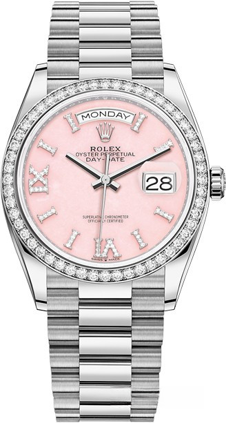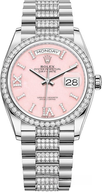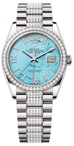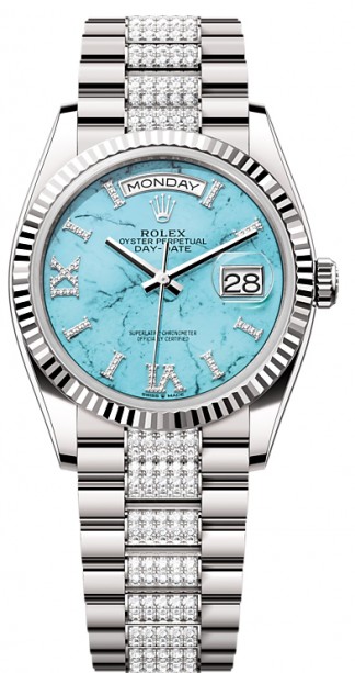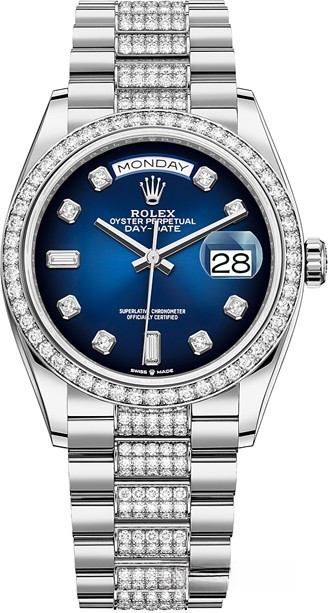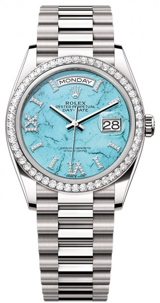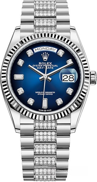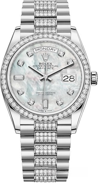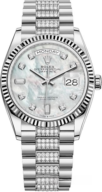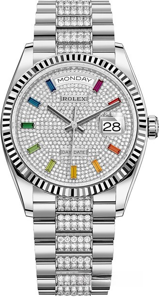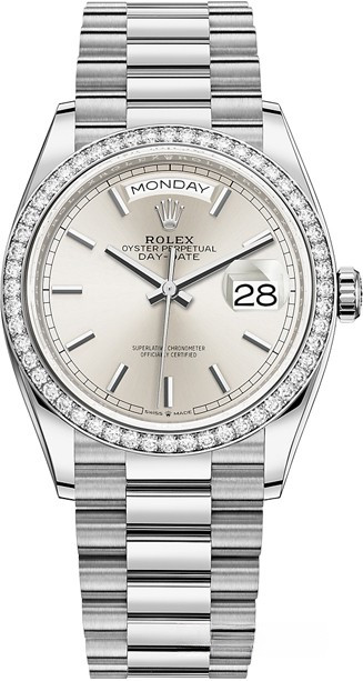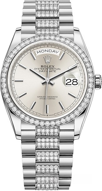 Водостойкие часы Rolex Day-Date Day-Date 36mm White Gold являются официально сертифицированным хронометром COSC, выпущены в круглом корпусе из белого золота 18к. Размер составляет 36 мм, водонепроницаемость 100 м. Внутри корпуса установлен автоматический механизм. На серебристом циферблате отображаются часы, минуты, секунды, дата, день недели. Часы комплектуются браслетом из белого золота 18к.