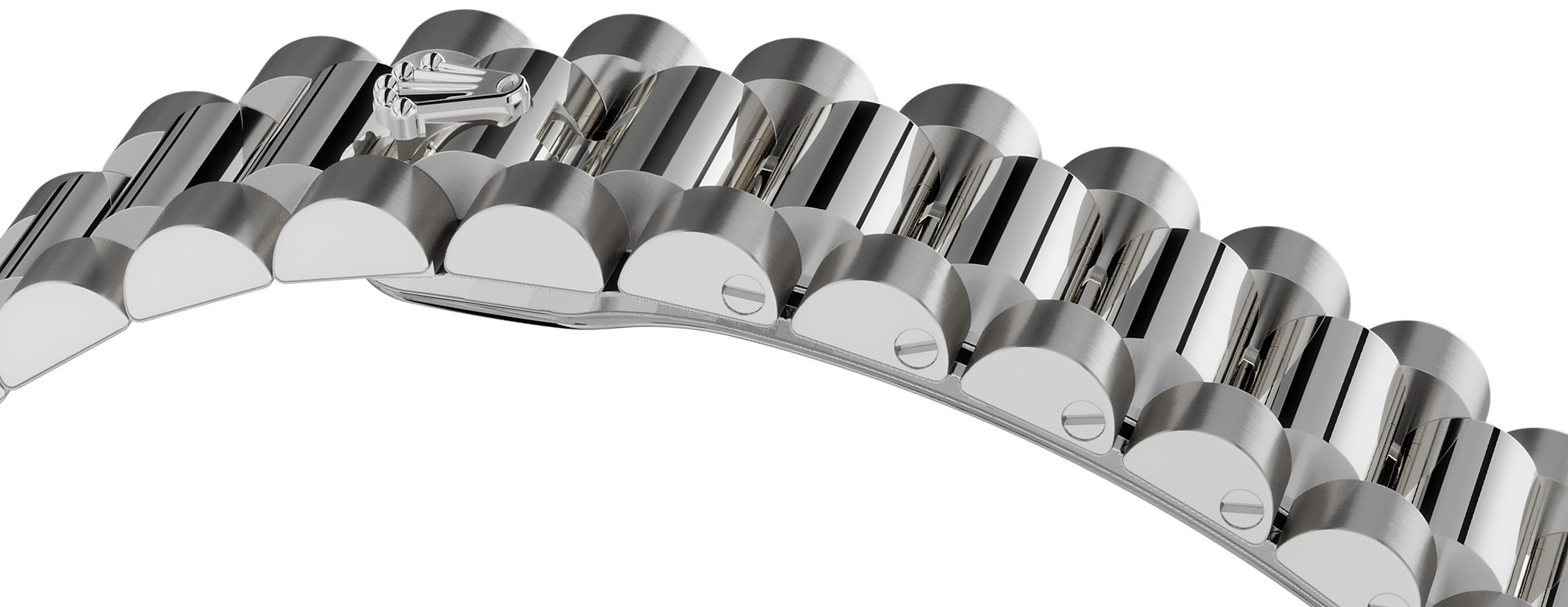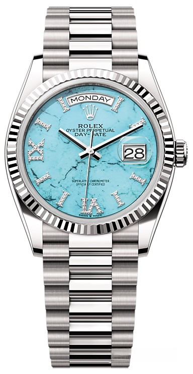 Водостойкие часы Rolex Day-Date 36mm White Gold являются официально сертифицированным хронометром COSC, выпущены в круглом корпусе из белого золота 18к. Размер составляет 36 мм, водонепроницаемость 100 м. Внутри корпуса установлен автоматический механизм, Калибр 3255, обладающий запасом хода 70 часов. На циферблате из бирюзы с белыми бриллиантами отображаются часы, минуты, секунды, дата, день недели. Часы комплектуются браслетом из белого золота 18к.