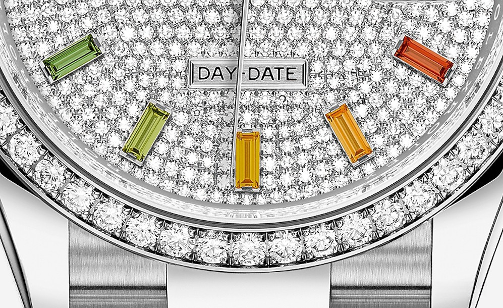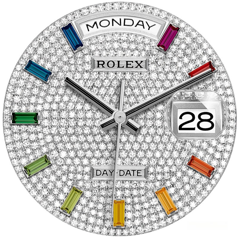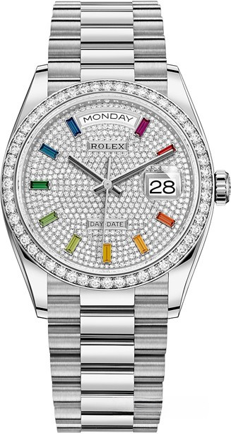 Водостойкие часы Rolex Day-Date Day-Date 36mm White Gold являются официально сертифицированным хронометром COSC, выпущены в круглом корпусе из белого золота 18к. Размер составляет 36 мм, водонепроницаемость 100 м. Внутри корпуса установлен автоматический механизм. На циферблате с белыми бриллиантами и разноцветными багетными сапфирами отображаются часы, минуты, секунды, дата, день недели. Часы комплектуются браслетом из белого золота 18к. Безель из белых бриллиантов.