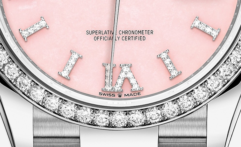 Водостойкие часы Rolex Day-Date Day-Date 36mm White Gold являются официально сертифицированным хронометром COSC, выпущены в круглом корпусе из белого золота 18к. Размер составляет 36 мм, водонепроницаемость 100 м. Внутри корпуса установлен автоматический механизм. На циферблате из розового опала с белыми бриллиантами отображаются часы, минуты, секунды, дата, день недели. Часы комплектуются браслетом из белого золота 18к. Безель из белых бриллиантов.