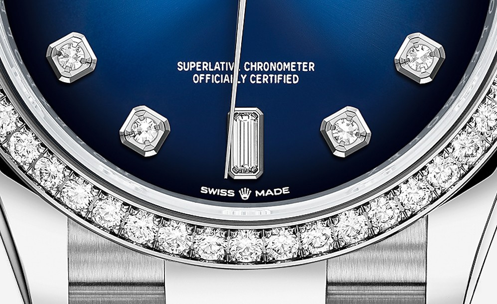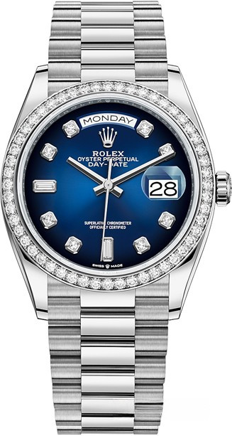Водостойкие часы Rolex Day-Date Day-Date 36mm White Gold являются официально сертифицированным хронометром COSC, выпущены в круглом корпусе из белого золота 18к. Размер составляет 36 мм, водонепроницаемость 100 м. Внутри корпуса установлен автоматический механизм. На синем циферблате с 10-ю белыми бриллиантами отображаются часы, минуты, секунды, дата, день недели. Часы комплектуются браслетом из белого золота 18к. Безель из белых бриллиантов.