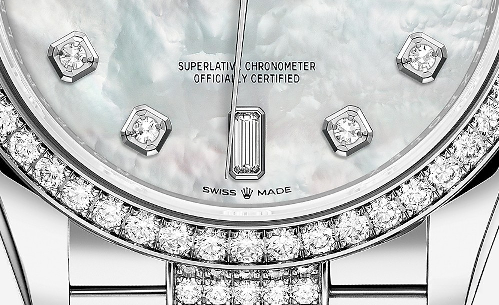 Водостойкие часы Rolex Day-Date Day-Date 36mm White Gold являются официально сертифицированным хронометром COSC, выпущены в круглом корпусе из белого золота 18к. Размер составляет 36 мм, водонепроницаемость 100 м. Внутри корпуса установлен автоматический механизм. На белом жемчужном циферблате с 10-ю белыми бриллиантами отображаются часы, минуты, секунды, дата, день недели. Часы комплектуются браслетом из белого золота 18к, инкрустированным белыми бриллиантами. Безель из белых бриллиантов.