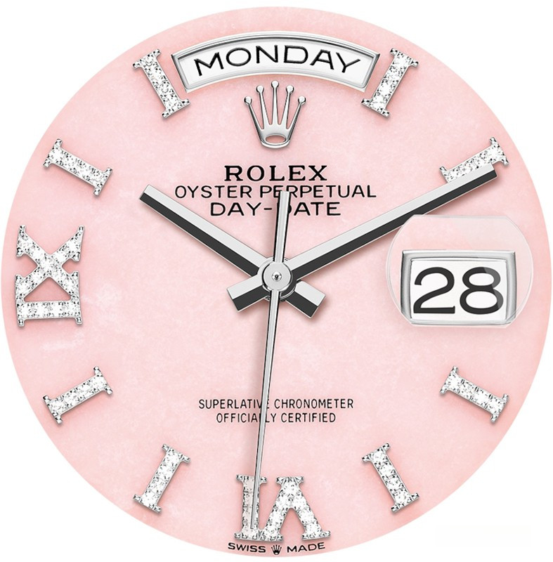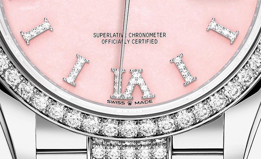 Водостойкие часы Rolex Day-Date Day-Date 36mm White Gold являются официально сертифицированным хронометром COSC, выпущены в круглом корпусе из белого золота 18к. Размер составляет 36 мм, водонепроницаемость 100 м. Внутри корпуса установлен автоматический механизм. На розовом циферблате с белыми бриллиантами отображаются часы, минуты, секунды, дата, день недели. Часы комплектуются браслетом из белого золота 18к, инкрустированным белыми бриллиантами. Безель из белых бриллиантов.
