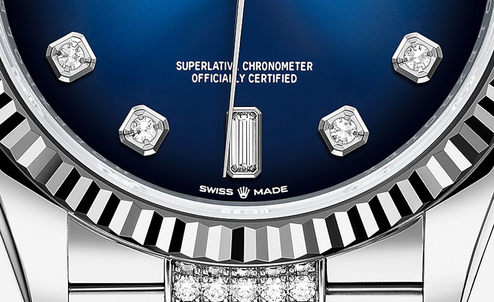 Водостойкие часы Rolex Day-Date Day-Date 36mm White Gold являются официально сертифицированным хронометром COSC, выпущены в круглом корпусе из белого золота 18к. Размер составляет 36 мм, водонепроницаемость 100 м. Внутри корпуса установлен автоматический механизм. На синем циферблате с 10-ю белыми бриллиантами отображаются часы, минуты, секунды, дата, день недели. Часы комплектуются браслетом из белого золота 18к, инкрустированным белыми бриллиантами.