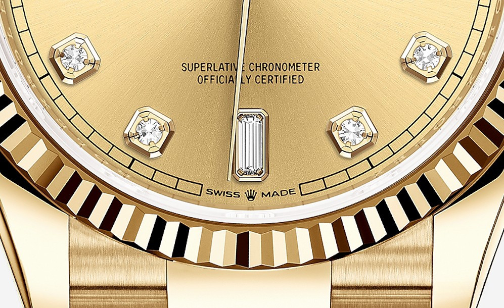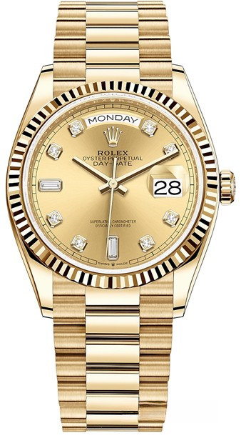 Водостойкие часы Rolex Day-Date Day-Date 36mm Yellow Gold являются официально сертифицированным хронометром COSC, выпущены в круглом корпусе из желтого золота 18к. Размер составляет 36 мм, водонепроницаемость 100 м. Внутри корпуса установлен автоматический механизм. На золотистом циферблате с 10-ю белыми бриллиантами отображаются часы, минуты, секунды, дата, день недели. Часы комплектуются браслетом из желтого золота 18к.