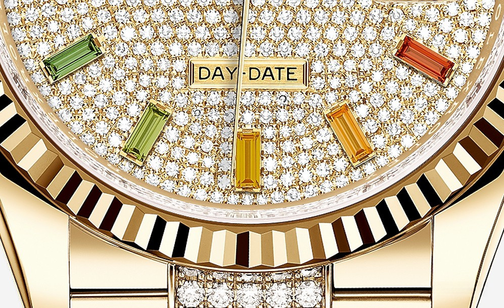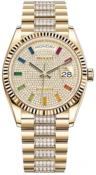 Водостойкие часы Rolex Day-Date Day-Date 36mm Yellow Gold являются официально сертифицированным хронометром COSC, выпущены в круглом корпусе из желтого золота 18к. Размер составляет 36 мм, водонепроницаемость 100 м. Внутри корпуса установлен автоматический механизм. На циферблате с белыми бриллиантами и разноцветными багетными сапфирами отображаются часы, минуты, секунды, дата, день недели. Часы комплектуются браслетом из желтого золота 18к, инкрустированным белыми бриллиантами.