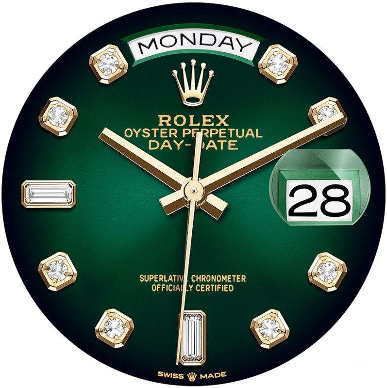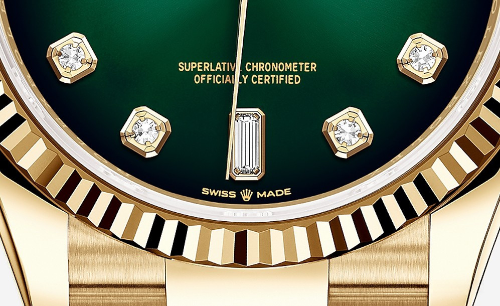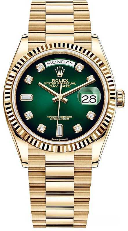Водостойкие часы Rolex Day-Date Day-Date 36mm Yellow Gold являются официально сертифицированным хронометром COSC, выпущены в круглом корпусе из желтого золота 18к. Размер составляет 36 мм, водонепроницаемость 100 м. Внутри корпуса установлен автоматический механизм. На зеленом циферблате с 10-ю белыми бриллиантами отображаются часы, минуты, секунды, дата, день недели. Часы комплектуются браслетом из желтого золота 18к.