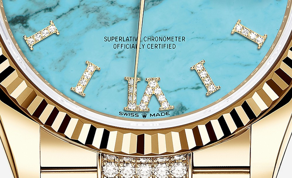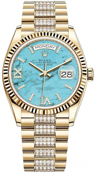 Водостойкие часы Rolex Day-Date Day-Date 36mm Yellow Gold являются официально сертифицированным хронометром COSC, выпущены в круглом корпусе из желтого золота 18к. Размер составляет 36 мм, водонепроницаемость 100 м. Внутри корпуса установлен автоматический механизм. На бирюзовом циферблате с белыми бриллиантами отображаются часы, минуты, секунды, дата, день недели. Часы комплектуются браслетом из желтого золота 18к, инкрустированным белыми бриллиантами.