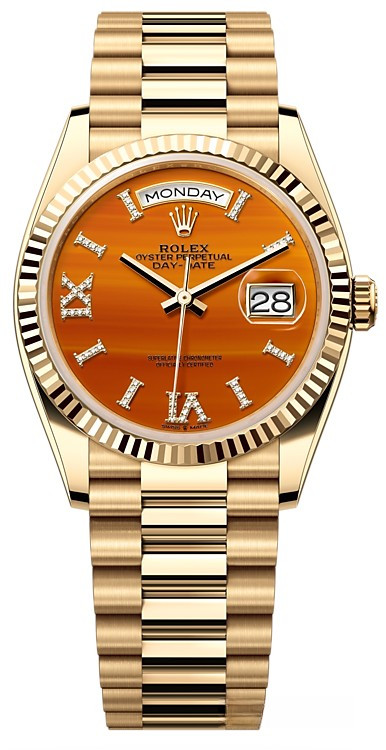 Водостойкие часы Rolex Day-Date 36mm Yellow Gold являются официально сертифицированным хронометром COSC, выпущены в круглом корпусе из желтого золота 18к. Размер составляет 36 мм, водонепроницаемость 100 м. Внутри корпуса установлен автоматический механизм, Калибр 3255, обладающий запасом хода 70 часов. На циферблате из сердолика с белыми бриллиантами отображаются часы, минуты, секунды, дата, день недели. Часы комплектуются браслетом из желтого золота 18к.